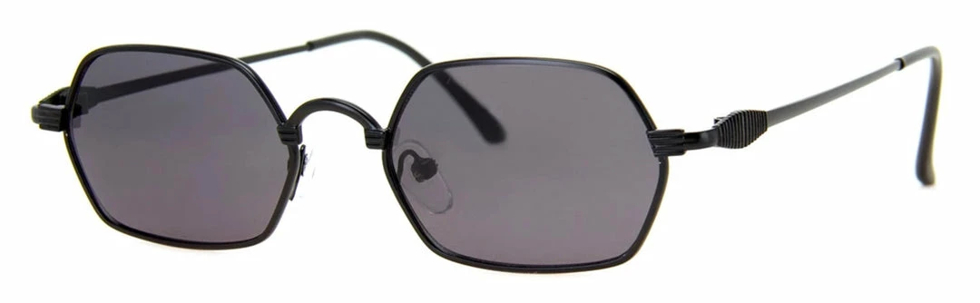 Micro – black metal framed, rounded hexagonal-shaped sunglasses with dark gray tinted lenses.