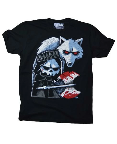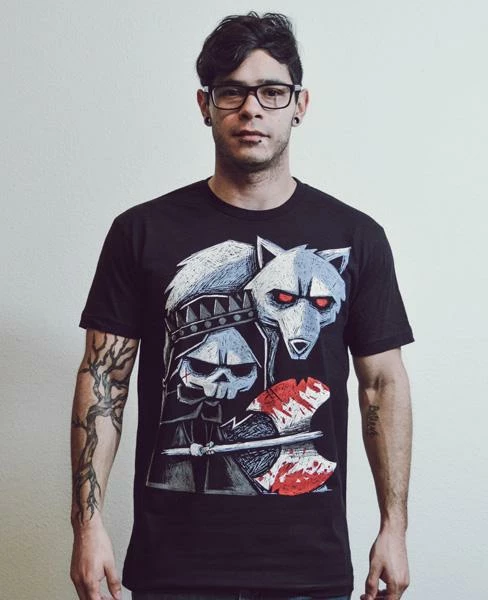 This short sleeve Akumu Ink crewneck features hand-drawn artwork of the aftermath of a battle featuring a warlord accompanied by his ever-loyal beast.