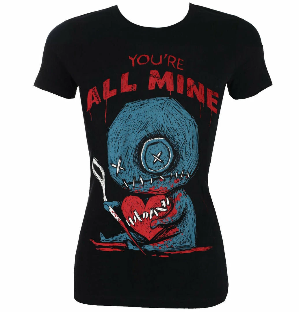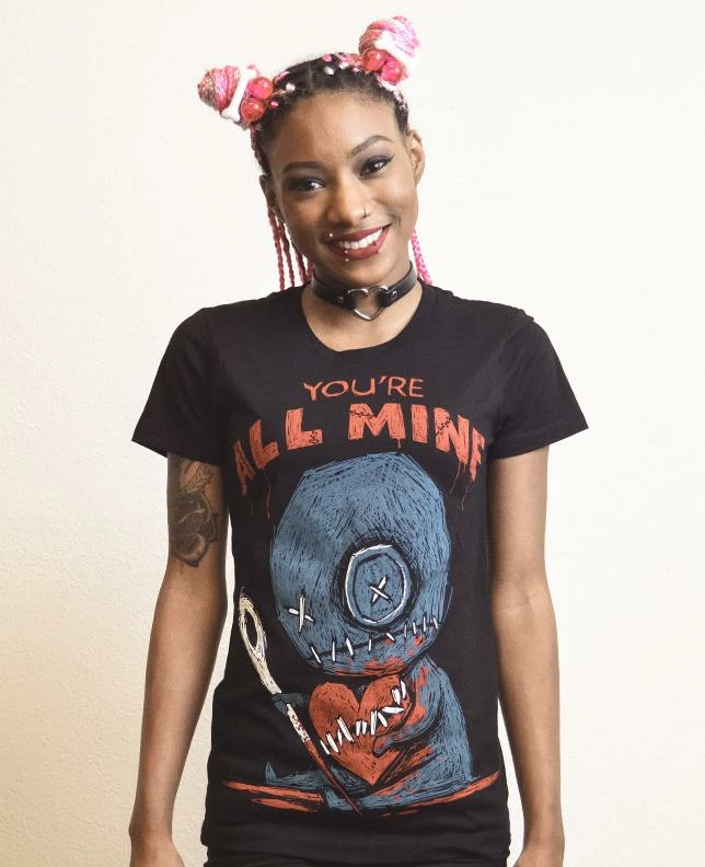 The Akumu Ink small coffin shaped logo is printed on the back near the neck like a signature on every shirt. Available in a women’s black 100% cotton t-shirt. Wash inside out in cold water and hang to dry. Model is wearing a size Small. Each shirt is hand printed in Southern California.