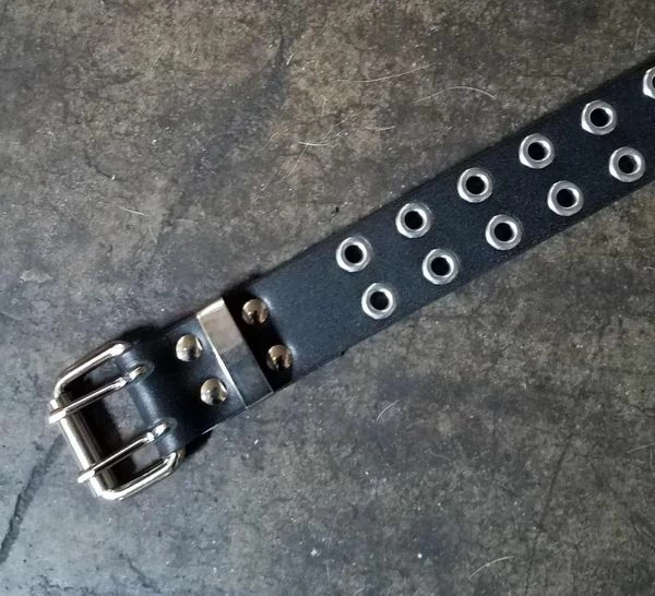 Description: Genuine leather two row eyelet belt. 1 1/2″ wide with two prong roller buckle and metal keeper.
