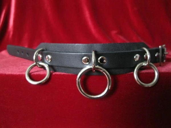 High quality 3-ring bondage wristband. The ring in the center is 1″ and the two on the side are .75″ Wristband is 1.25″ wide. 5/8″Buckle fastener with 3 adjustments at .5″ increments. Size shown is the middle hole of the three.