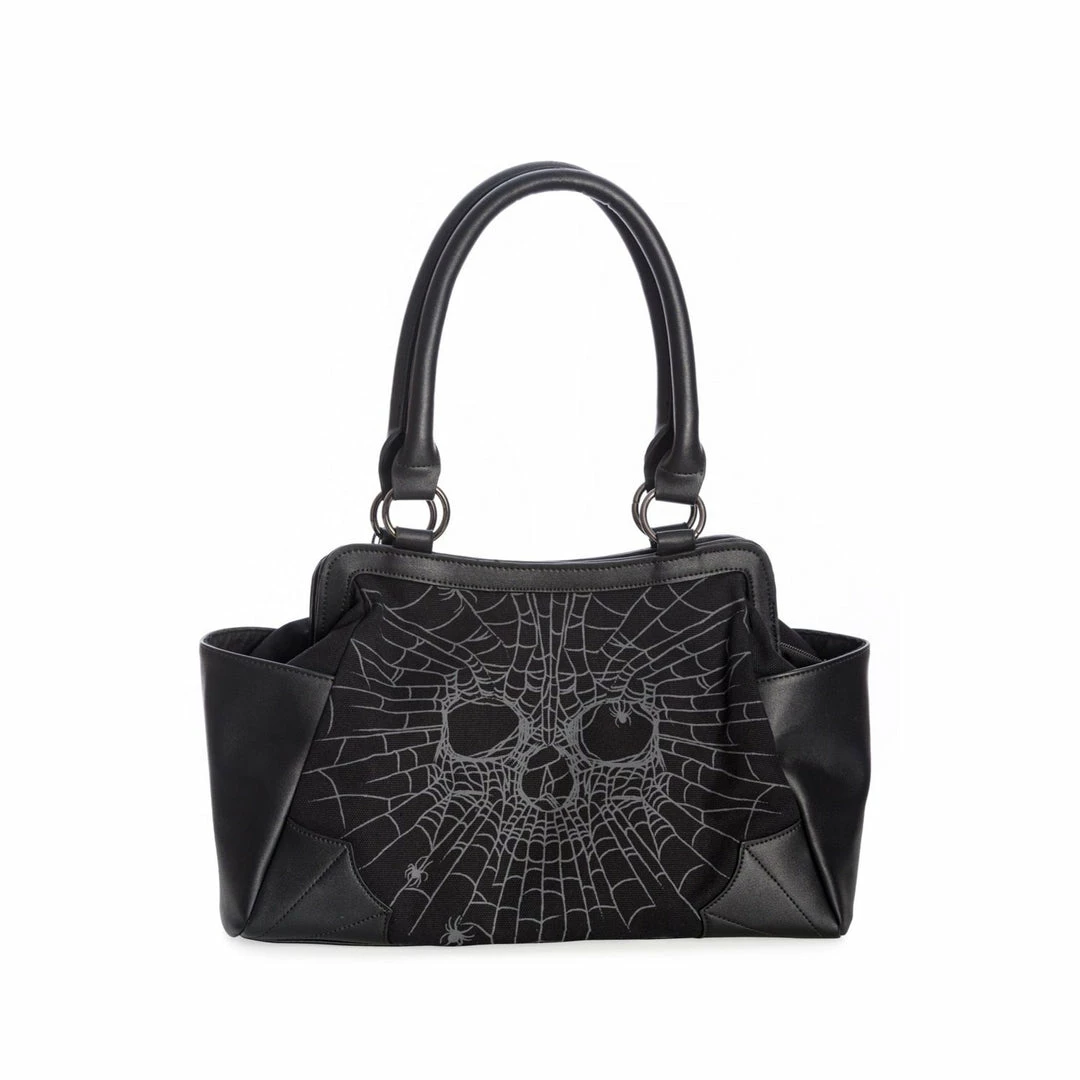 Black handbag featuring a spiderweb skull face.