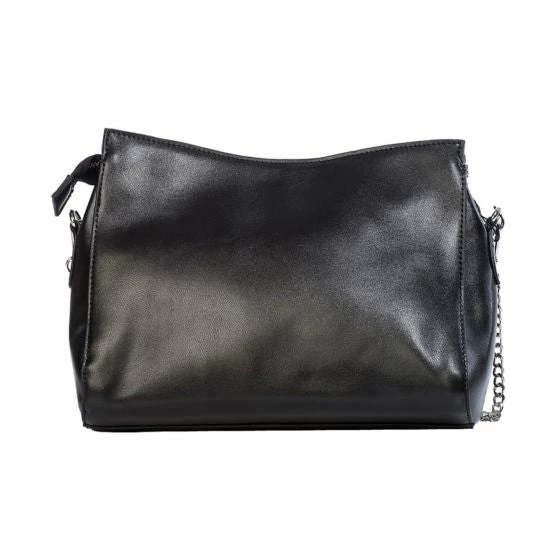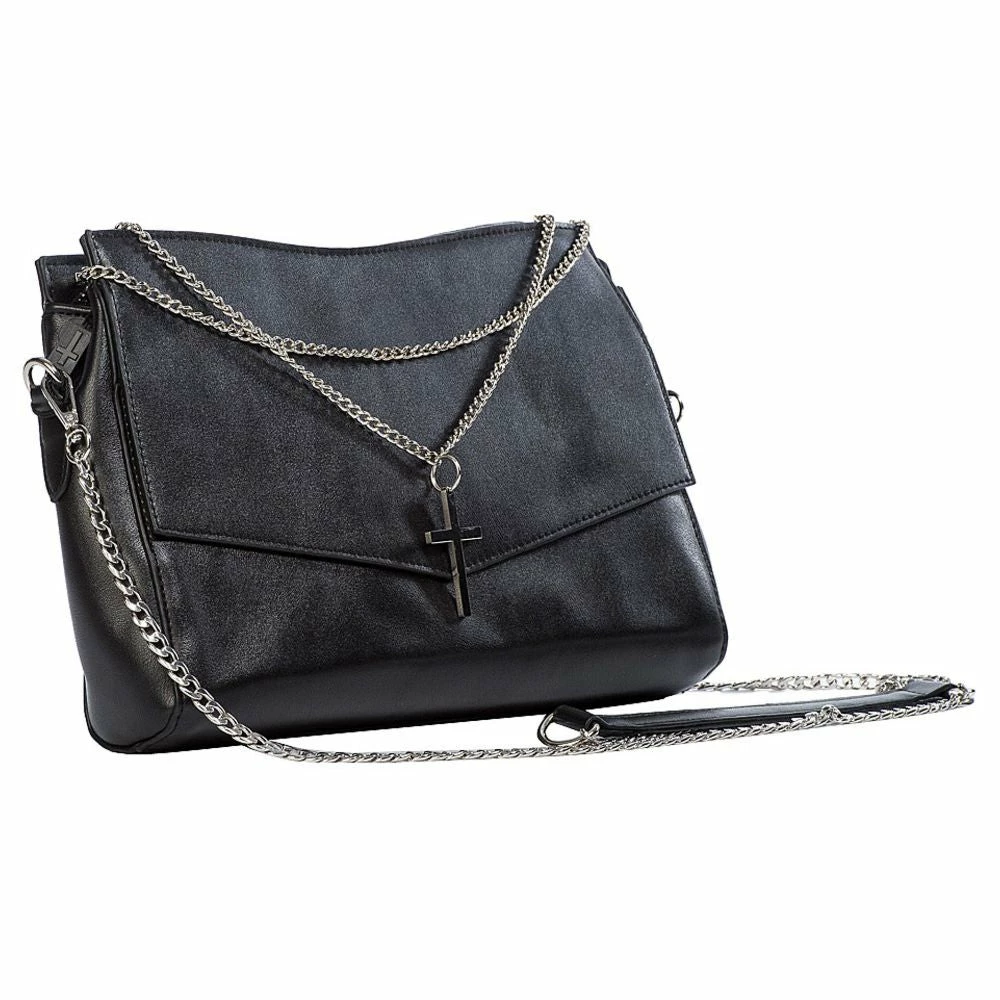 100% vegan glam goth handbag is just perfect for adding a touch of the alternative life to your wardrobe. Silver chain shoulder strap and front flap overlay.