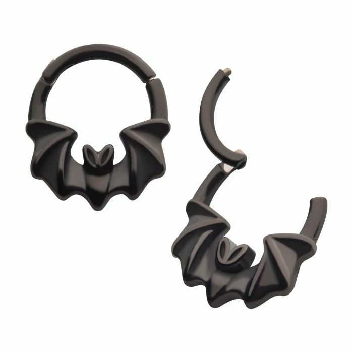 16g 3/8″ 316L Steel Black PVD Bat Front Facing Hinged Segment Clicker. Can be worn in lobe, cartilage, septum & daith piercings.