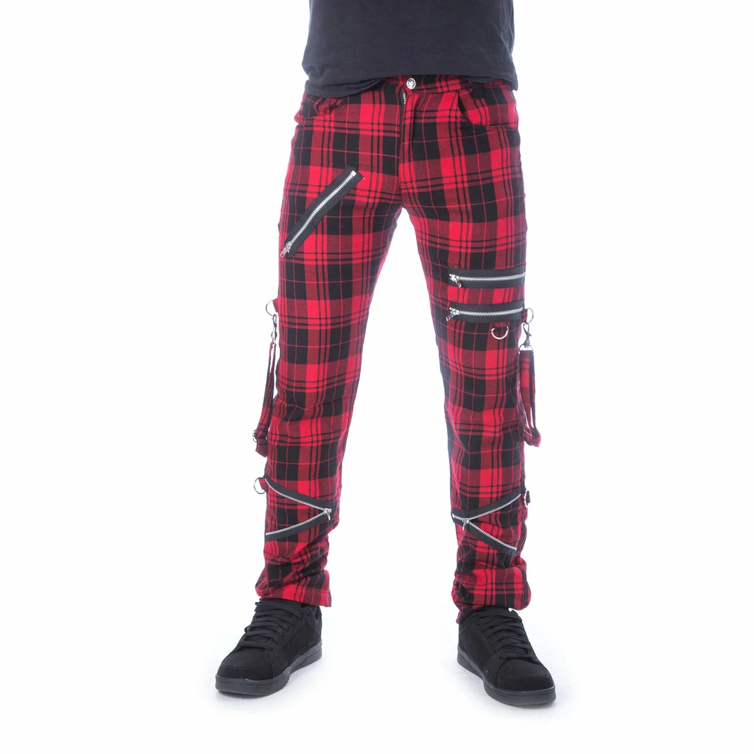 The Etienne Pants by Chemical Black are super-soft red tartan, slim fit pants for men with zipper accents,detachable bondage straps and D-rings.