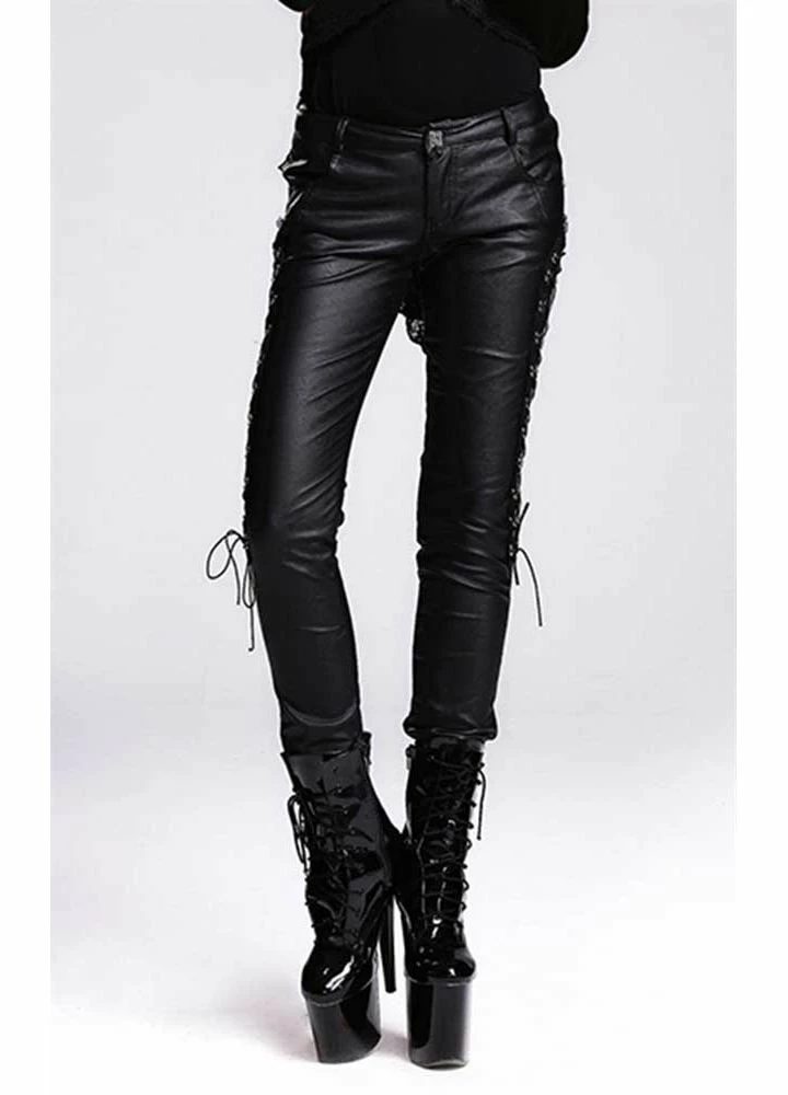 Awesome Gothic trousers from Devil Fashion. These gorgeous leather trousers feature a subtle baroque style design with black lace running down the side of each leg. As well as lace details, these trousers also include corset style lacing running down the sides adding an extra touch of Trad Goth to the look. Made from 60% Cotton and 40% Leather, these figure hugging trousers have a fair bit of stretch to them. The inseam of these trousers measures 30.5″ with a total length of 38″.