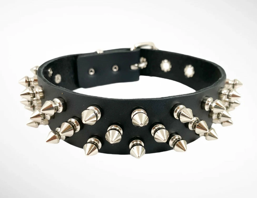 1 1/8″ BLACK LEATHER CHOKER WITH 3 ROW 1/2″ SPIKES