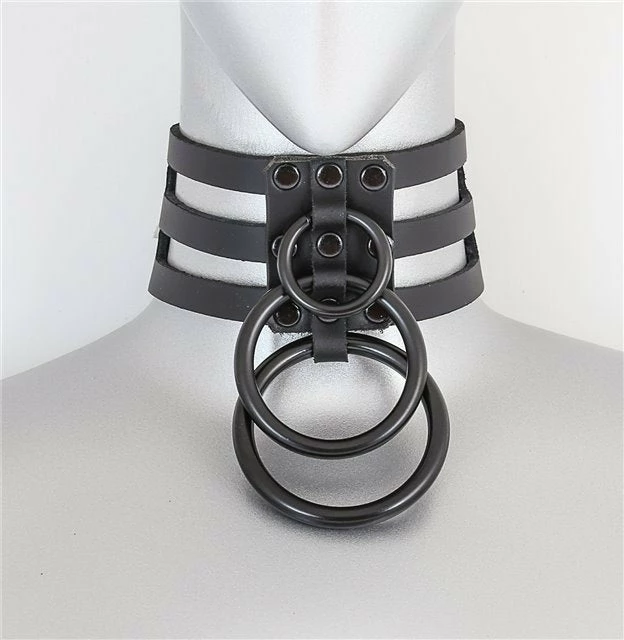 Three straps, with three black bondage rings, on thick, solid, genuine, black leather.