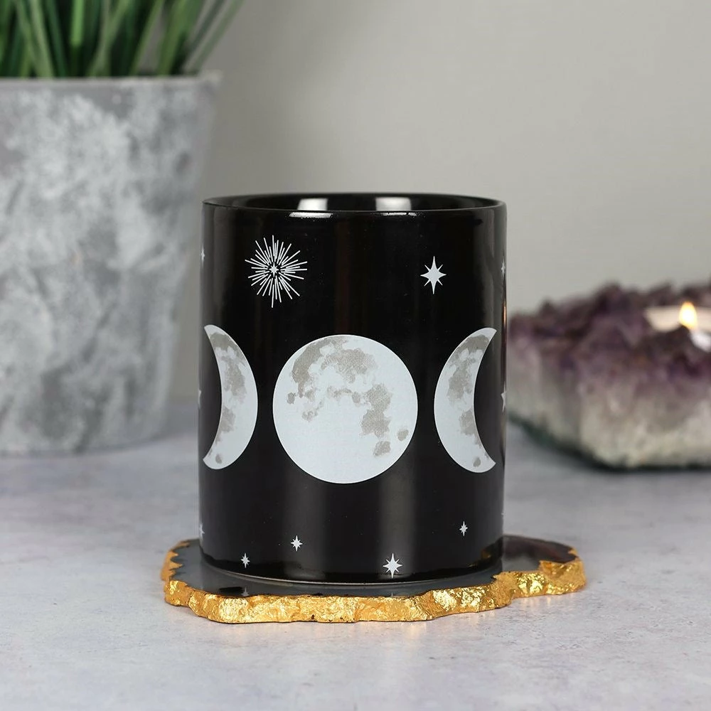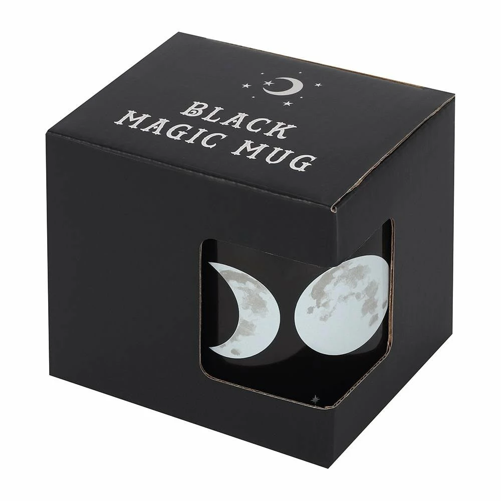 A quality ceramic mug featuring the Wiccan Triple Moon design on a black base. Dishwasher and Microwave safe. The Triple Moon symbolises the waxing, full and waning moon which represents the aspects of mother the maiden and the crone.