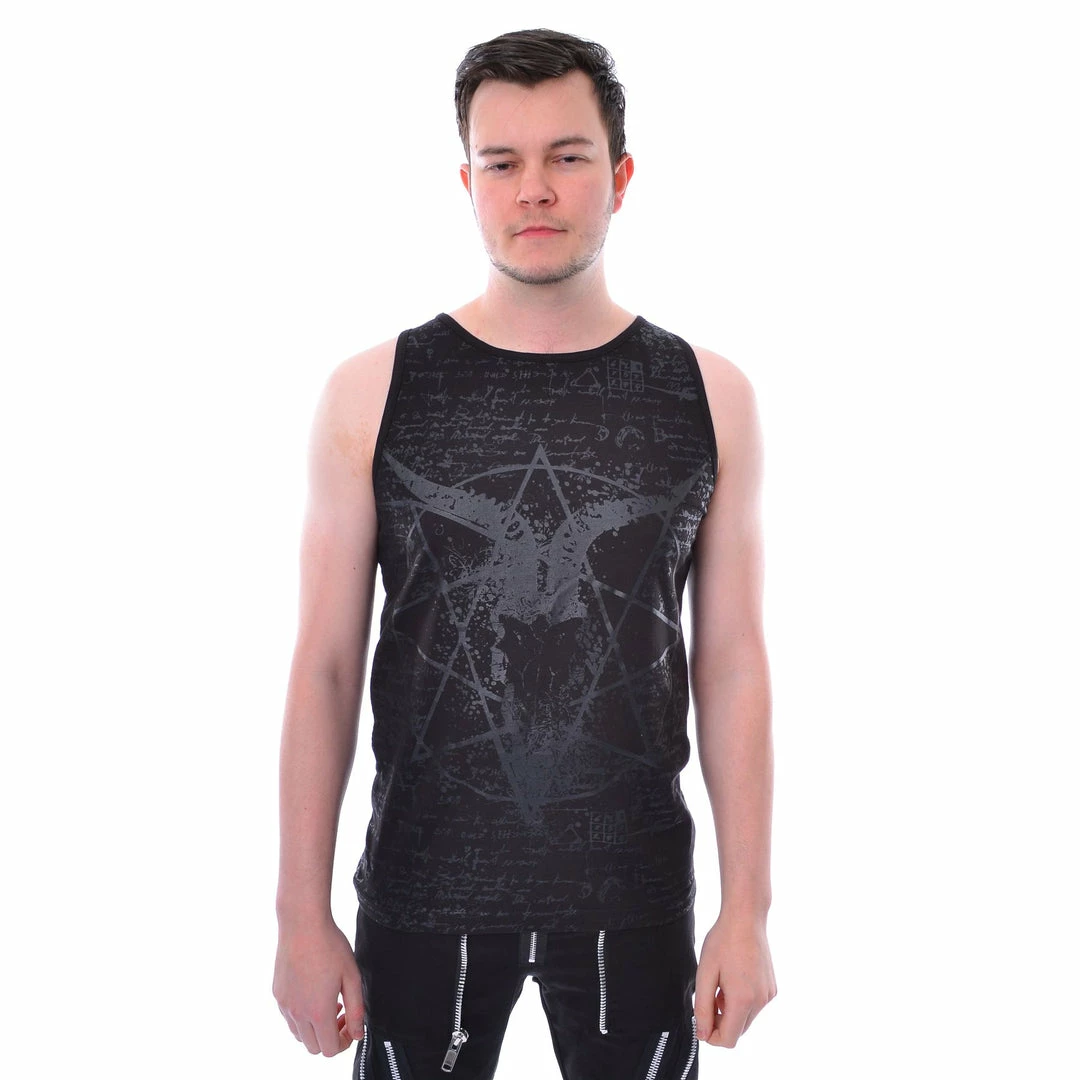 The Pentagram vest is a black sleeveless tee with an all-over black silk-screen print on the front and back. The front features a pentagram with a goat’s head skull at the center.