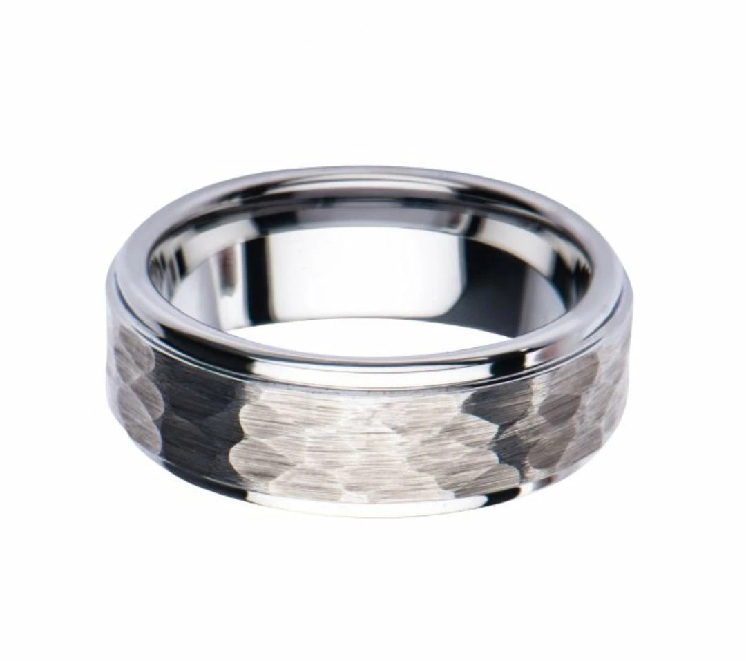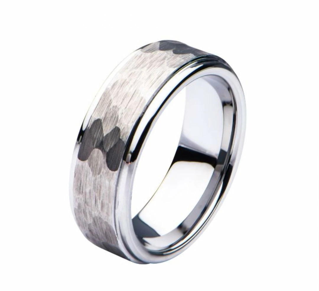 Men’s Classic Stainless Steel Hammered Band Ring. Timeless Wedding Band design in a virtually industructable form. Available Sizes: 9 – 12