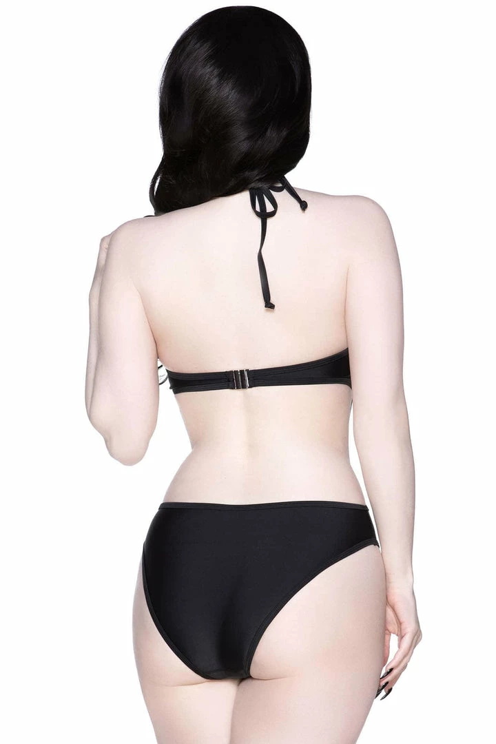 Who Said You Can’t Stay Spooky in The Summer? Feel spooktacular and look out of this world in the ‘Dig Her Bones’ One Piece. With black on black statement skeleton motif, cut-out sides and halter neck, be the most ghoulishly glam person at the pool or beach!