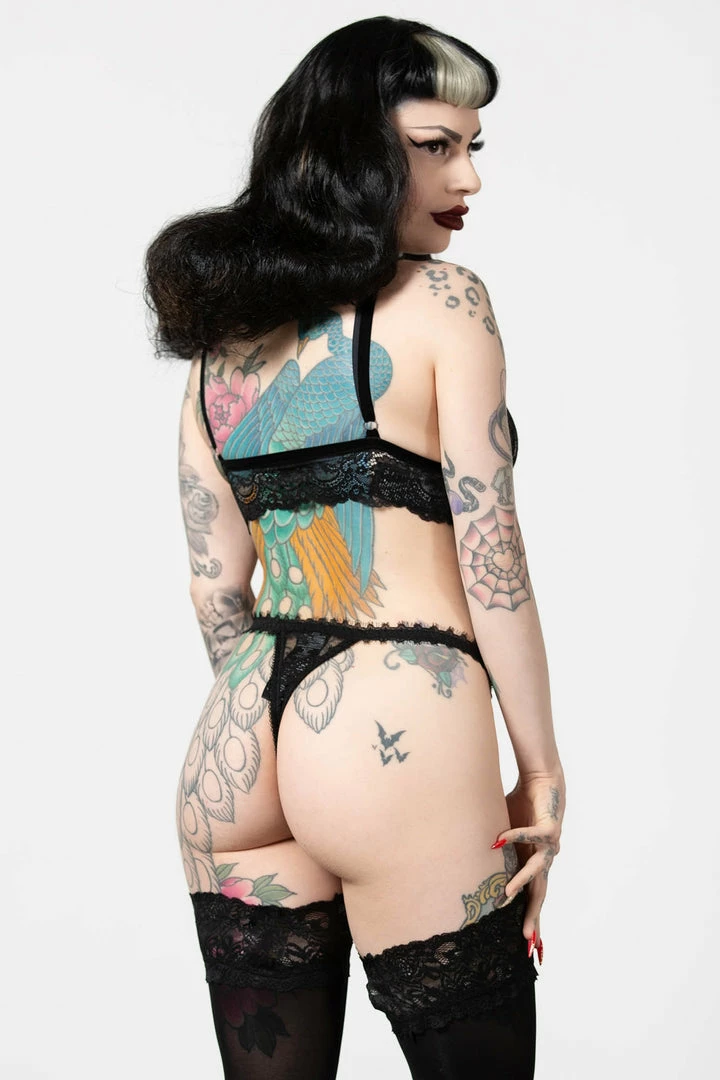 Become your own queen in our ‘Etienne’ Bralet. Crafted in soft touch lace with adjustable, stretch straps for the perfect fit and finished with a metal snake charm. Perfect for play dates with the devil, dancing barefoot under the moon or a coven sleepover.