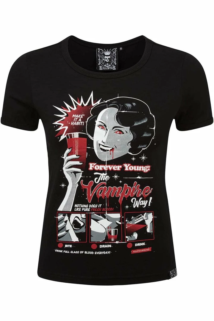 Transform yer life in our ‘Forever Young’ ringer top; constructed using soft-touch cotton which stretches perfectly for a comfortable and sleek fit. Bound neckline +sleeves and bold graphic; made for immortals – the perfect go-to piece for your daily adventures out the crypt!