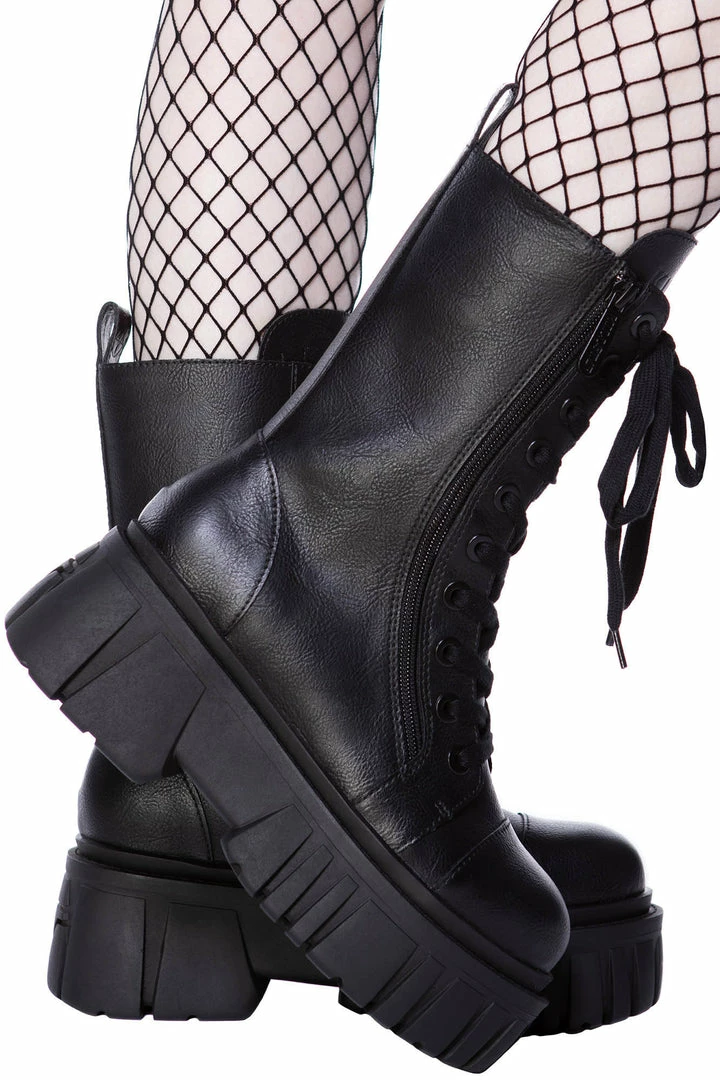Make ’em look twice with envy with the ‘ Kick the Bucket’ boots. In faux leather with lace-up front – featuring a chunky sole. Great for adding some serious attitude for yer day-to-day adventures out the crypt or causing havoc at night!
