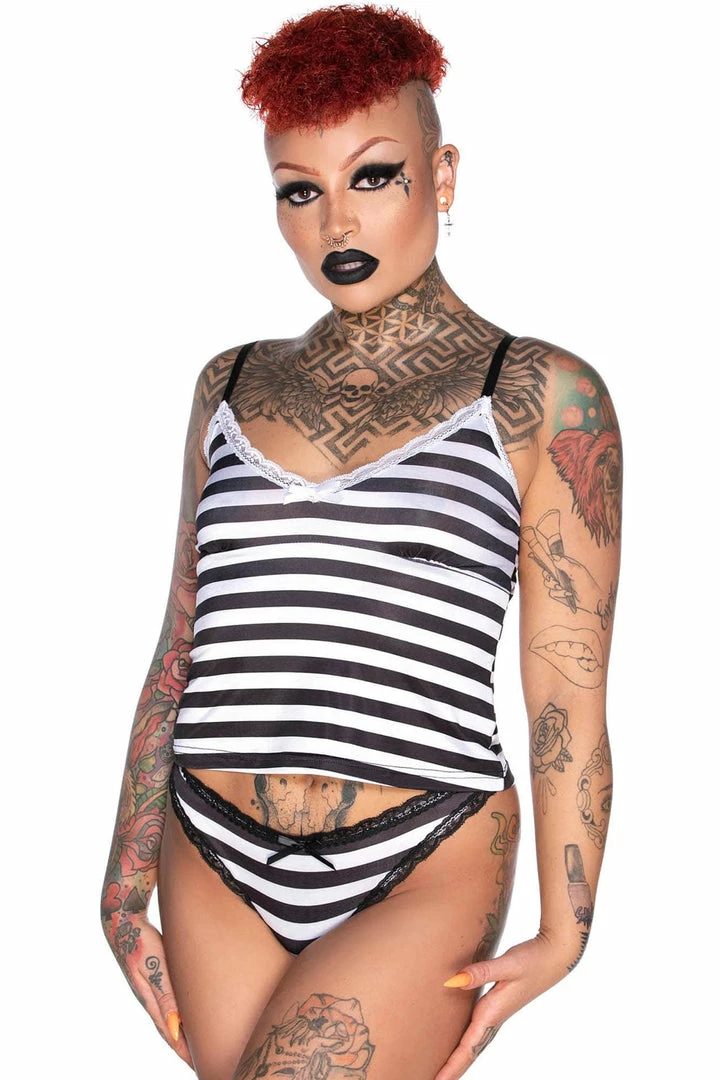 Lounging in yer coffin watchin’ Netflix is the life! The ‘Never Trust The Living’ cami is perfect for lazy days, sleep-overs, naps and movie-marathons. Made in a stretchy super soft fabric for perfect comfort and fit, featuring a contrast stripe print, thin shoulder straps and delicate lace trims.