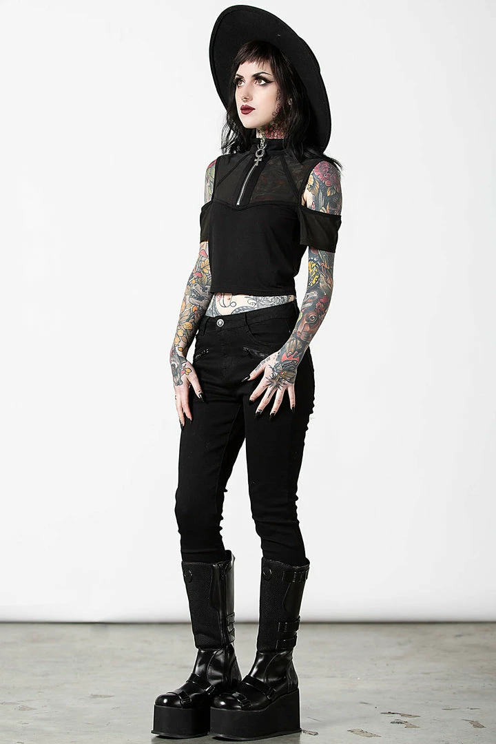 Drape your celestial self in our ‘Orb’ Crop top. Crafted in super soft, stretch fabric with mesh inserts and cold shoulder details. Finished with an XL mercury glyph pendant zipper it’s basic but never boring. The perfect piece to style into any stargazers wardrobe.