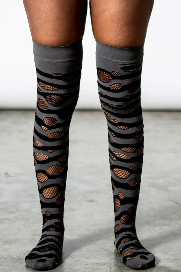 When all else fails, get new socks! Classic and exxxtra long socks – ‘Wretched Soul’ distress socks featuring contrast stripes and thigh-high look. With distressed details all over.