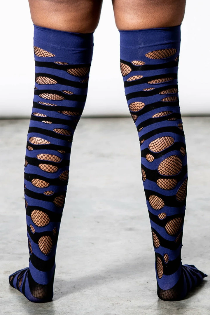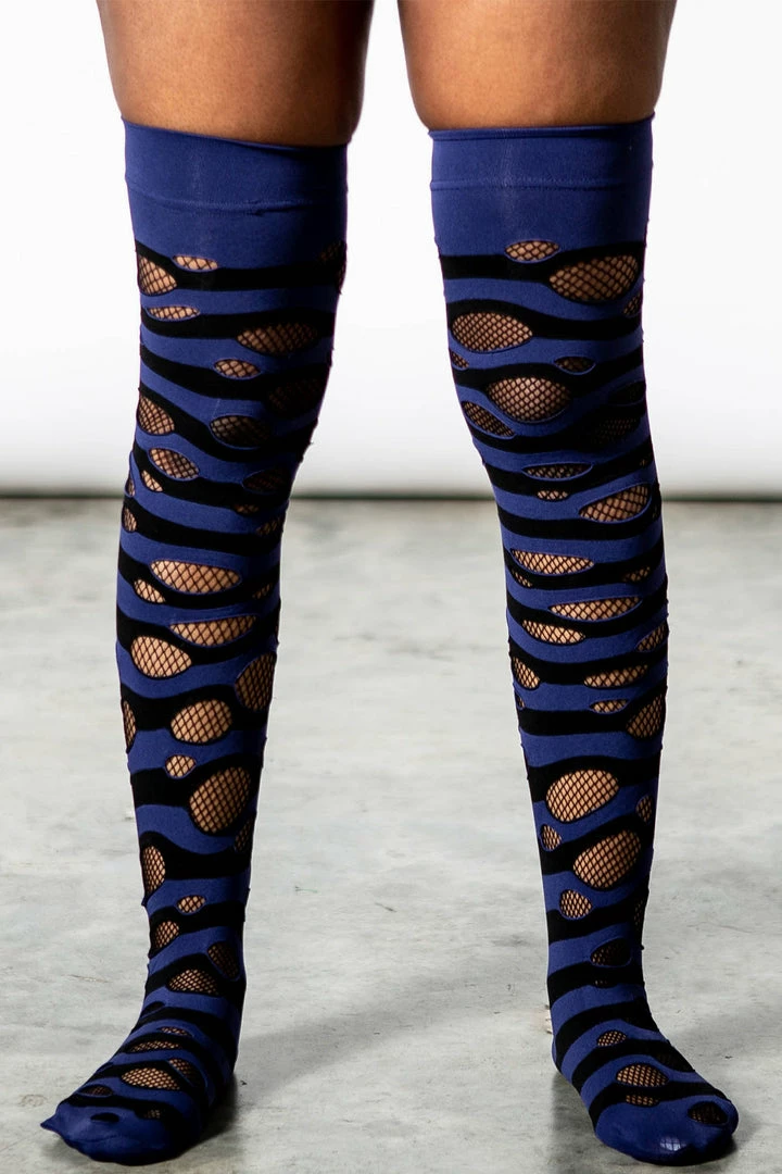 When all else fails, get new socks! Classic and exxxtra long socks – ‘Wretched Soul’ distress socks featuring contrast stripes and thigh-high look. With distressed details all over.