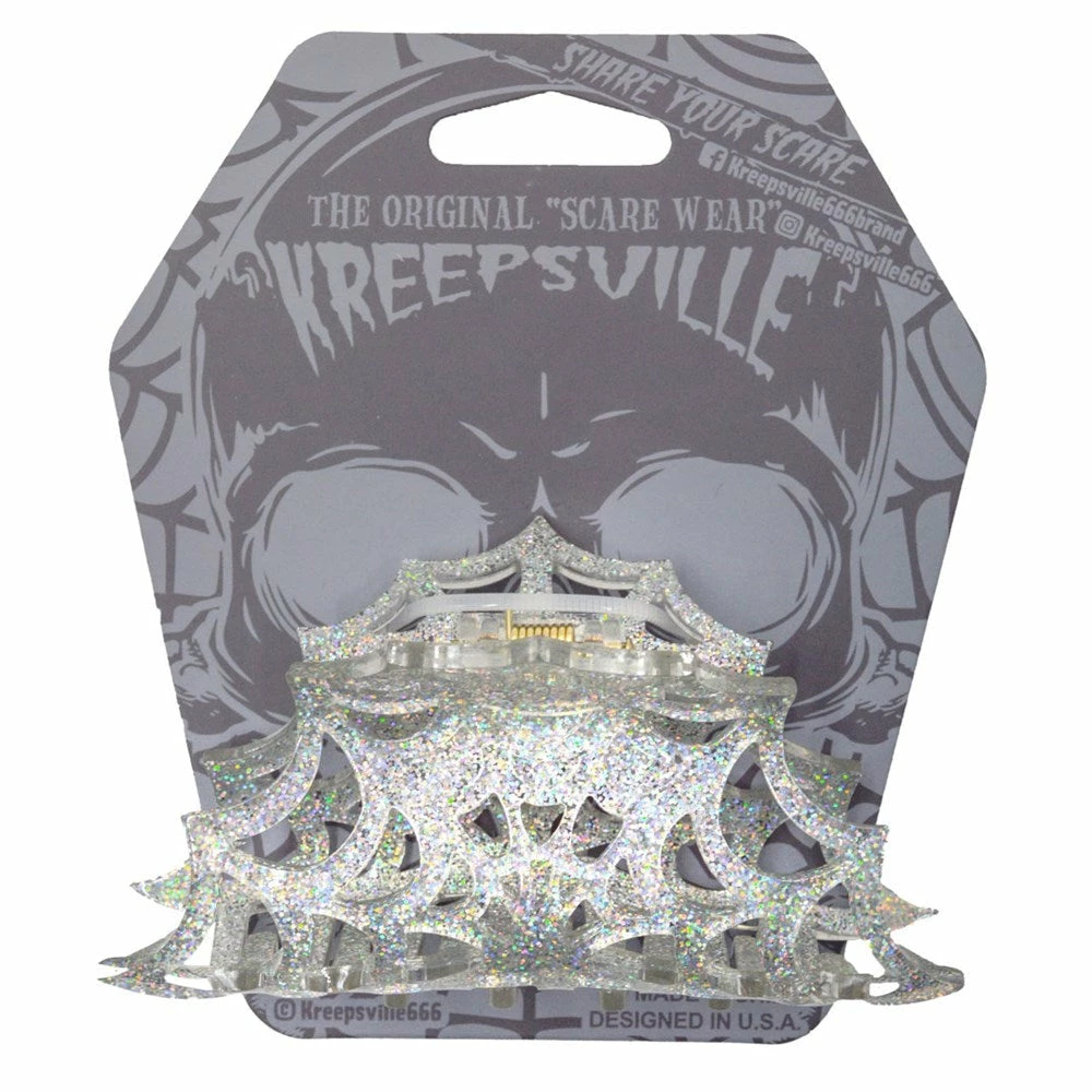 Kreepsville Spiderweb Hair Claw Clip Silver. Put some scare in your hair with our eye-catching, super sturdy spring claw clips. Perfect for up do’s and lazy hair days! Made with shiny holographic acrylic. Designed by ghouls in the USA! Clip size: 4.5″ (11.43cm) x 2″ (5cm).