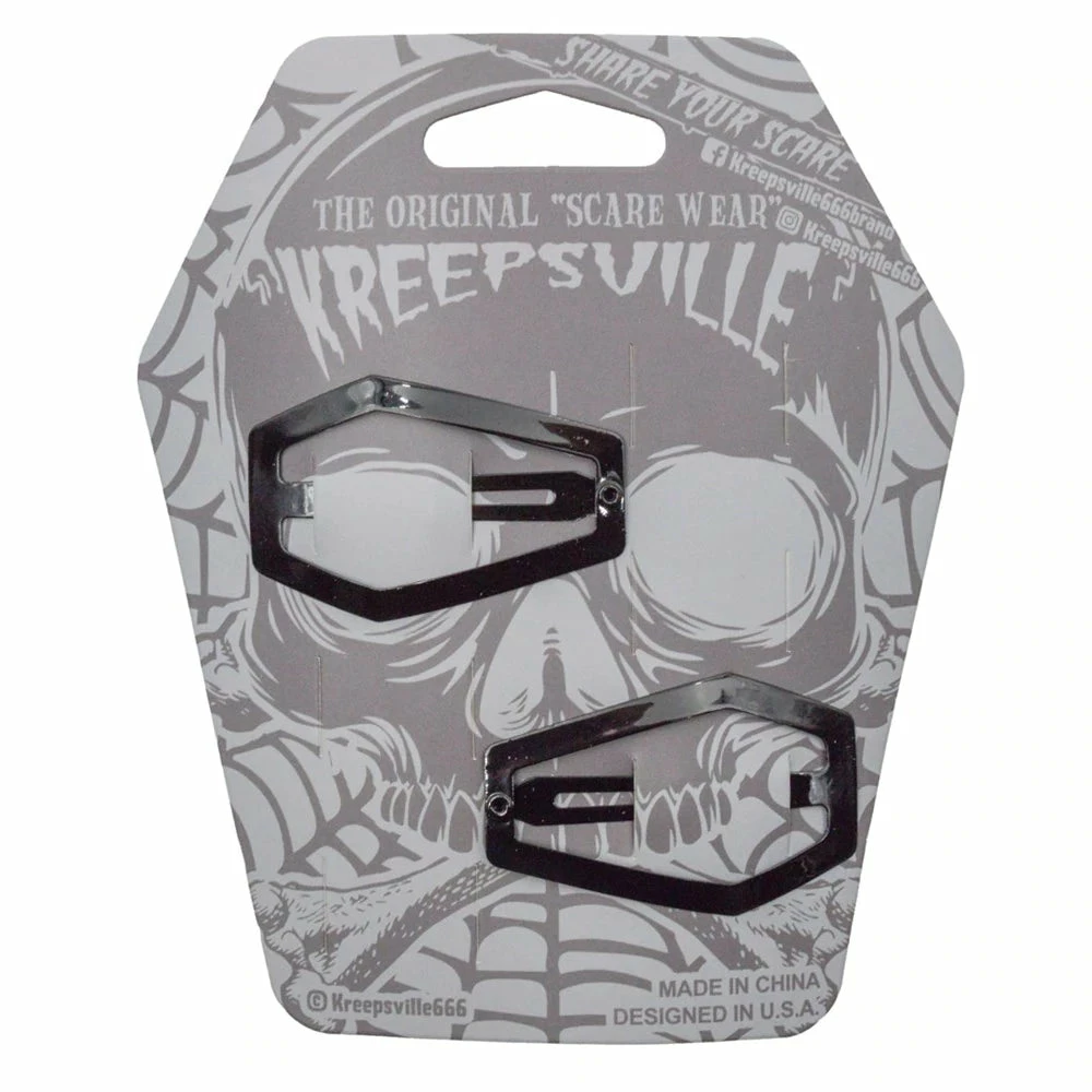 Kreepsville Coffin Snap Hair Clip Black. Come out of your coffin shell and feel alive in our coffin shaped hair clips, made with alloy metal. Designed by ghouls in the USA! Clip size: 2″ (5cm) x .9″ (3.0cm).
