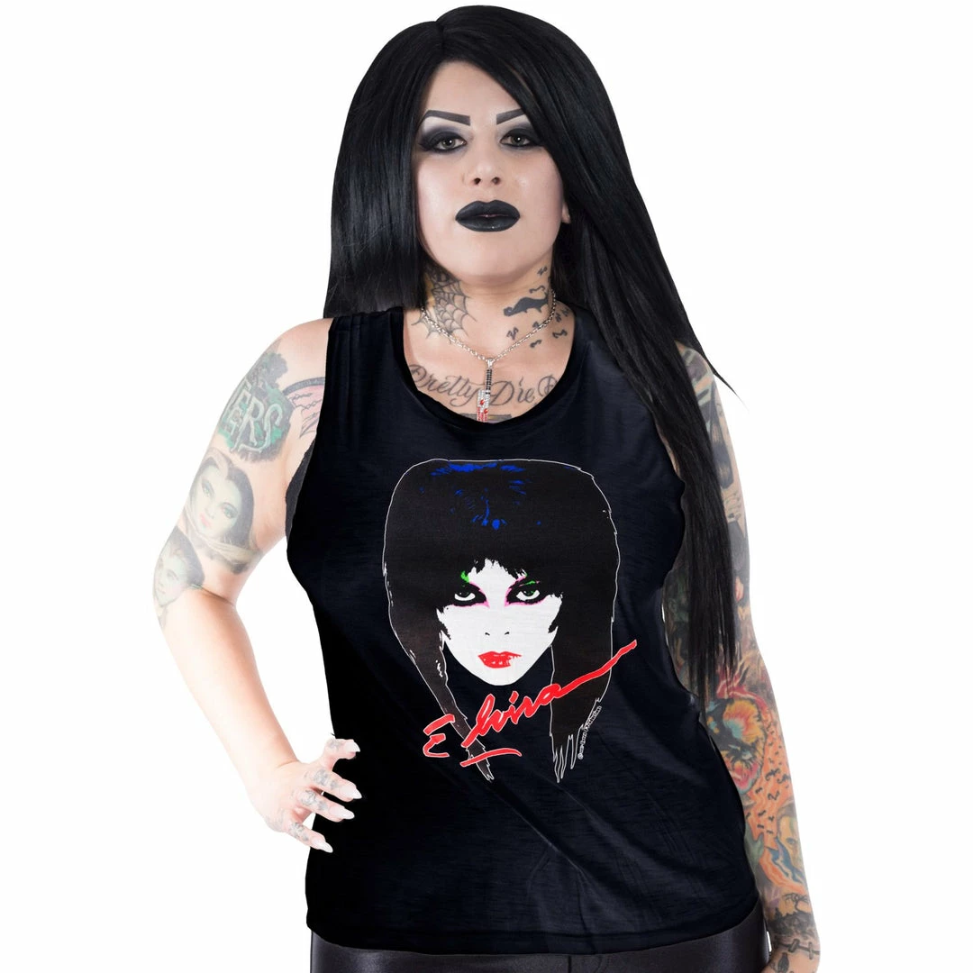 Elvira 1987 reprint sleeveless tee by kreepsville, slub loose fit sleeveless tee with screened Elvira mistress of the Dark design .Officially licensed Elvira Mistress of the Dark merchandise made in the USA.