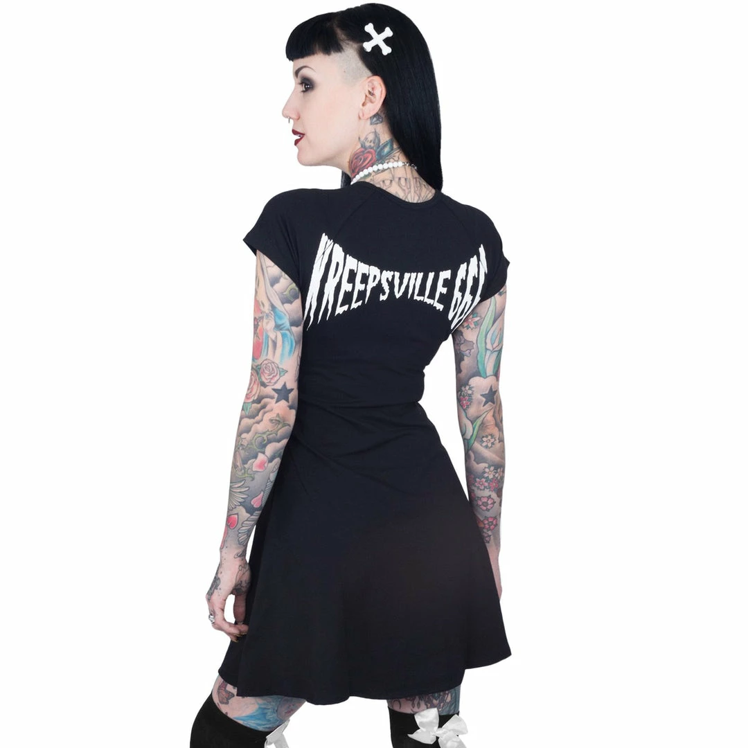 Kreepsville 666 re-vamp of the classic skele-bone dress, cotton spandex dress in fabulous flare fit with classic skele-bone discharge print on front and kreepsville 666 logo on back.
