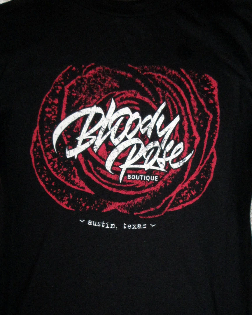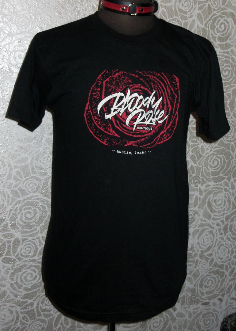 Our Bloody Rose Boutique red logo tee on the classic America Apparel jersey crew neck tee.