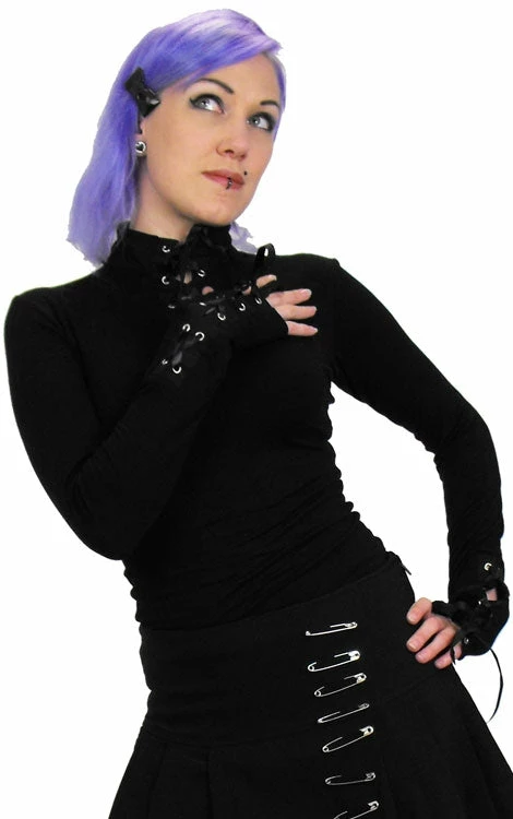 Soft black jersey top with black satin ribbon lace up features on the cuffs and collar. This blouse is comfortable like a leotard but updated for grown up wear.