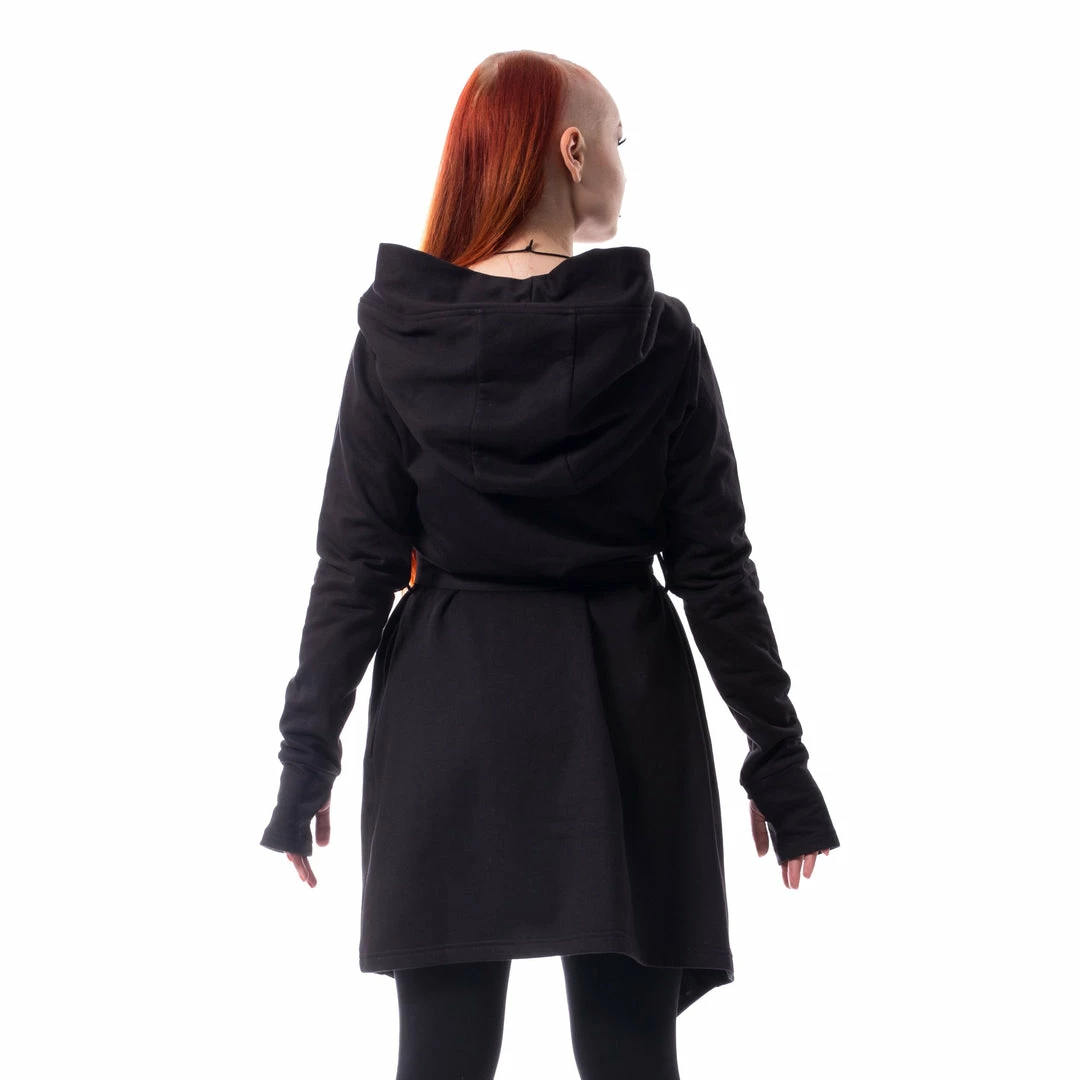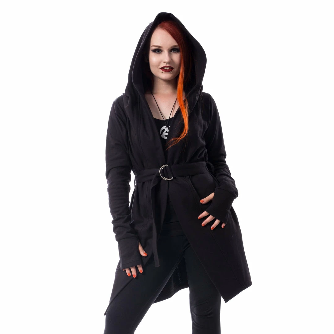 Black hooded long sleeve cardigan with black belt and thumb holes on the cuffs.