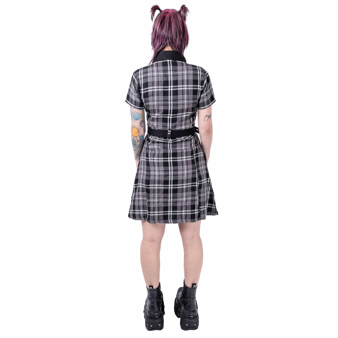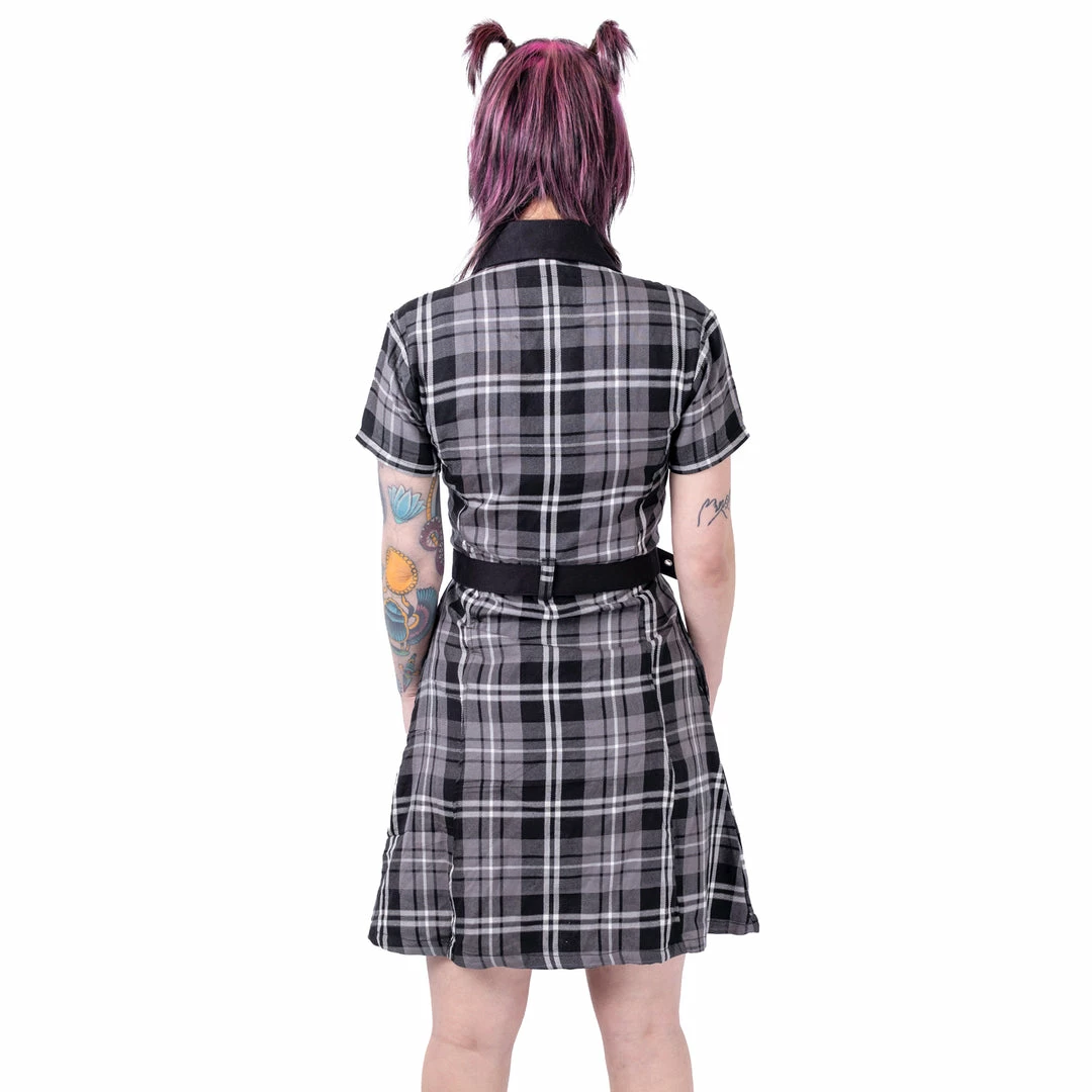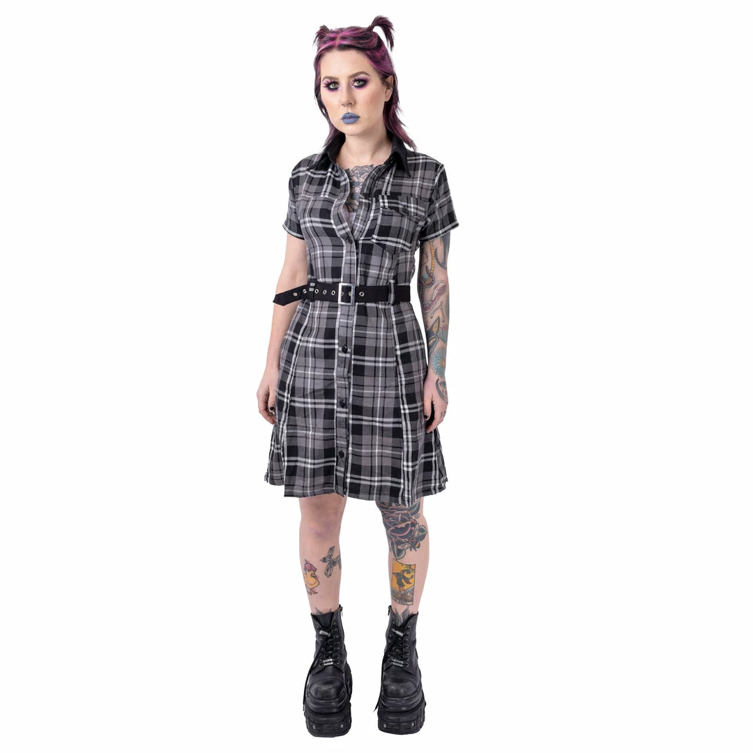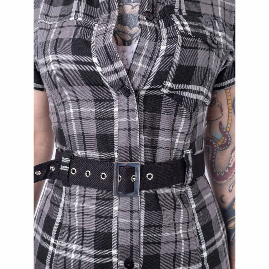 Grey plaid shirt dress from Poizen Industries. This cute dress has short sleeves, button us up the front and a belt.