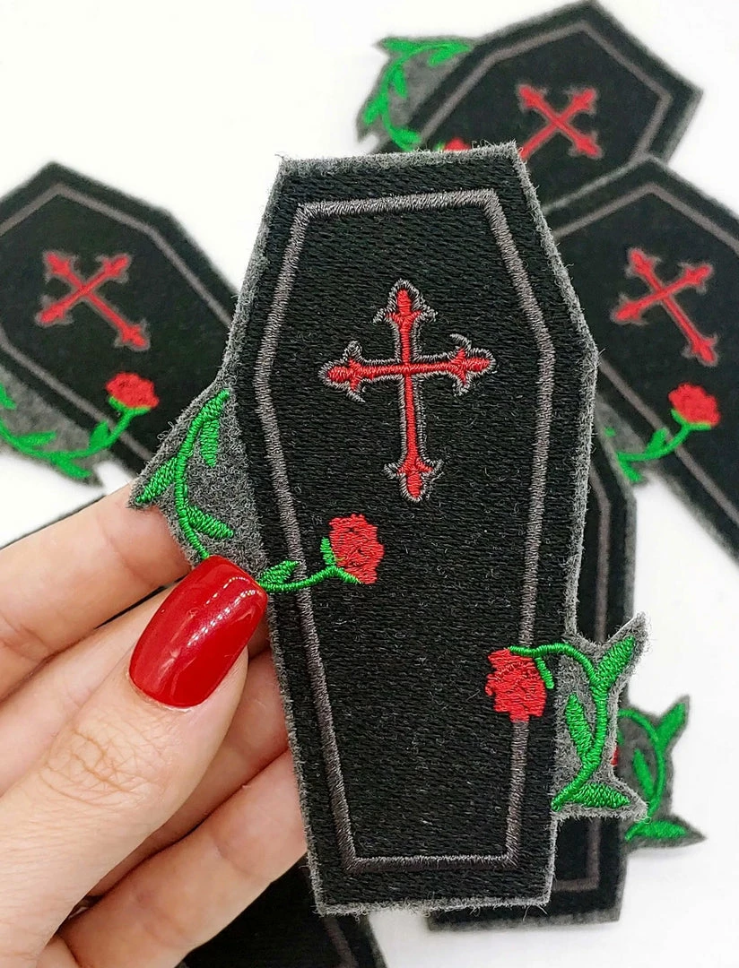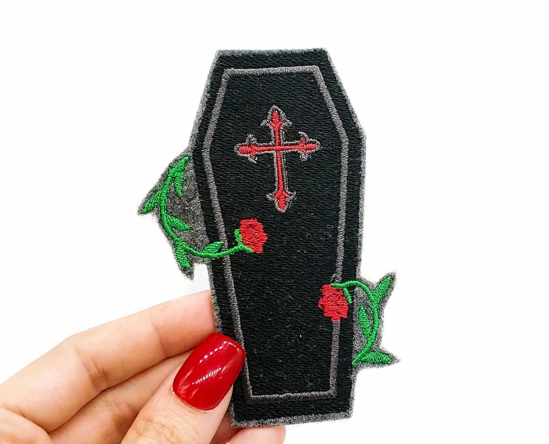 Coffin and Roses Gothic Iron On Embroidered Patch