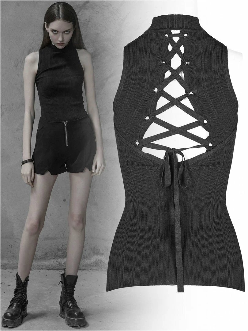 Gothic women’s black sleeveless high neck casual top with laced back.