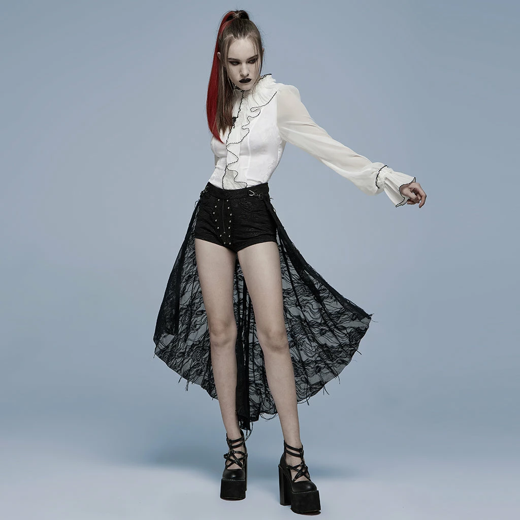 Black Gothic coffin shorts by Punk Rave. Made from a soft, stretchy fabric with a black on black print and features a coffin on the front and a detachable rear skirt.