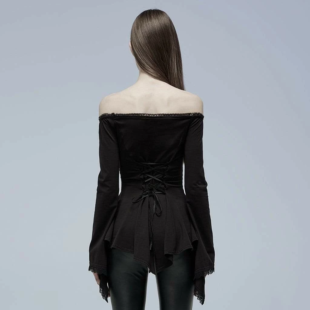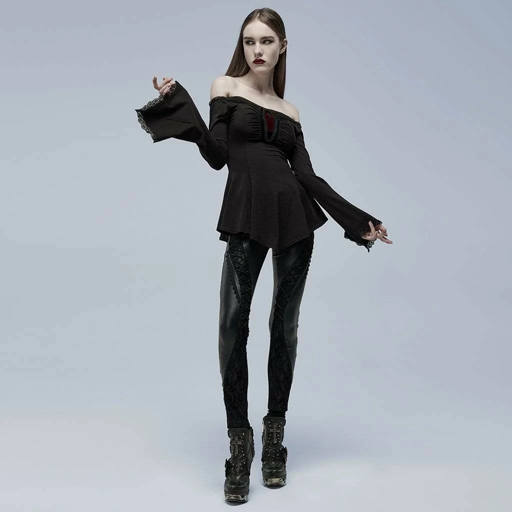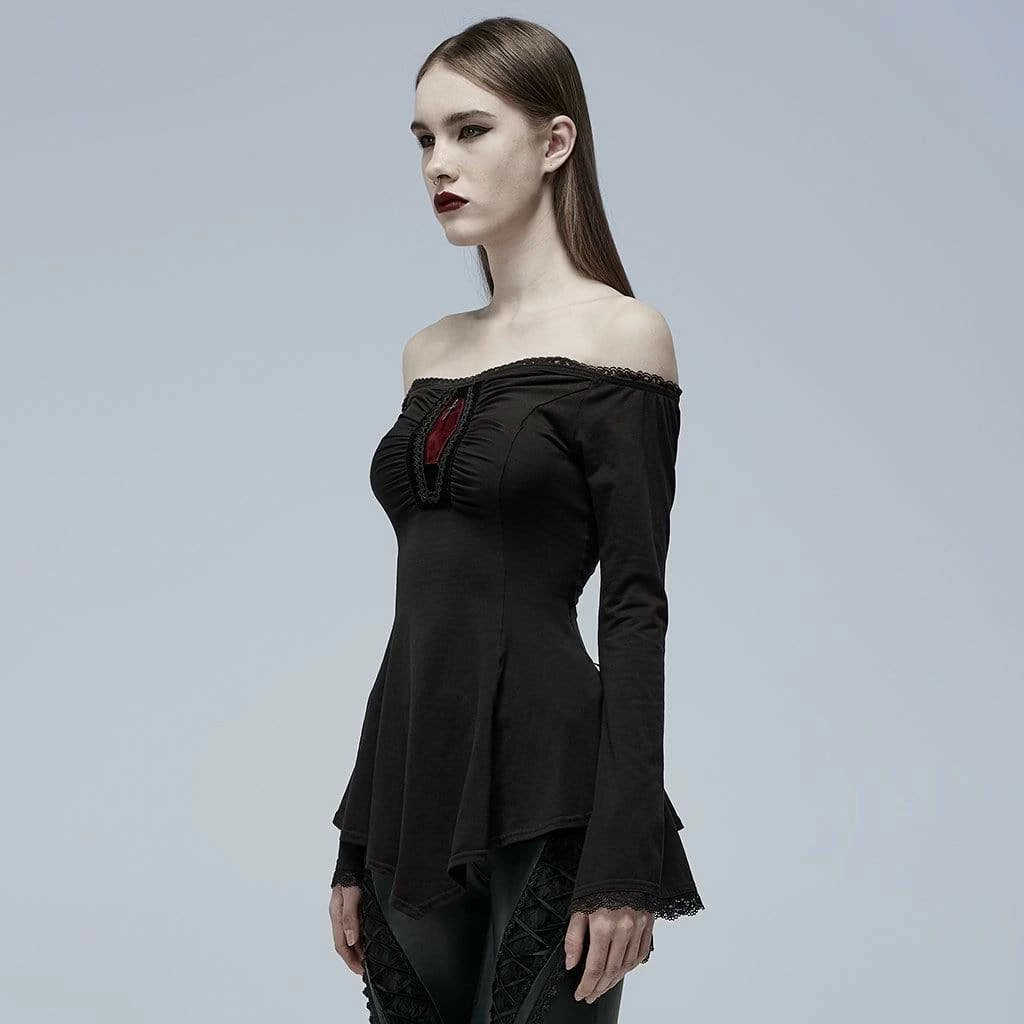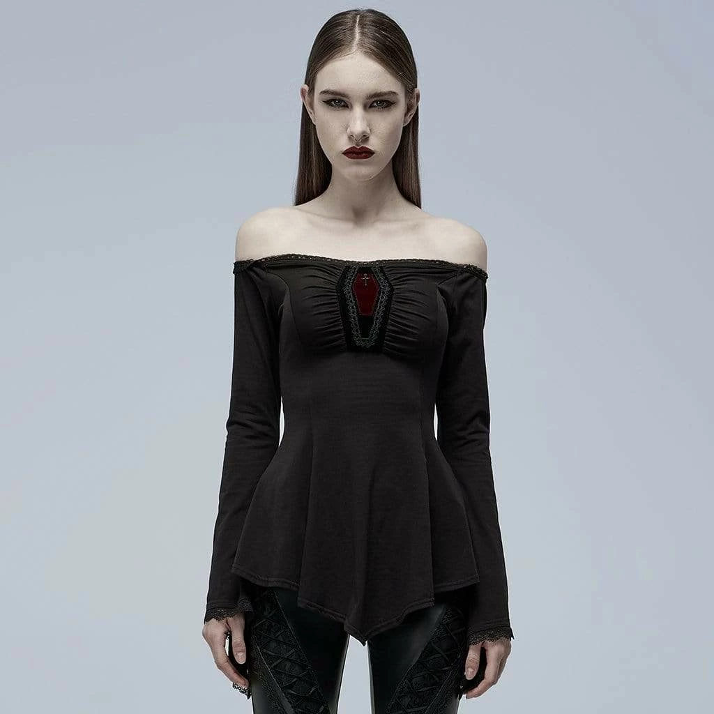 Off-the-shoulder, long sleeve, gothic top with a red velvet coffin and black cross on the front, and lace trim on the neck and sleeves. Stretch cotton.