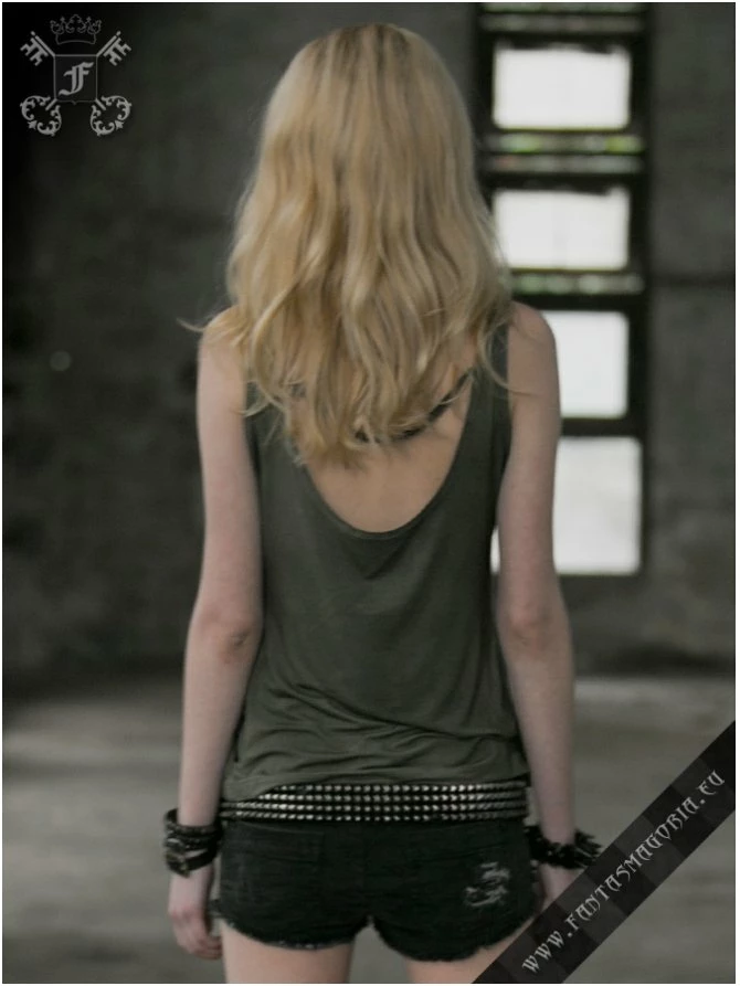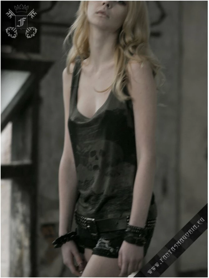 Ombre wash green tank top with a skull print at the front and the skull brooch-patch on the shoulder.