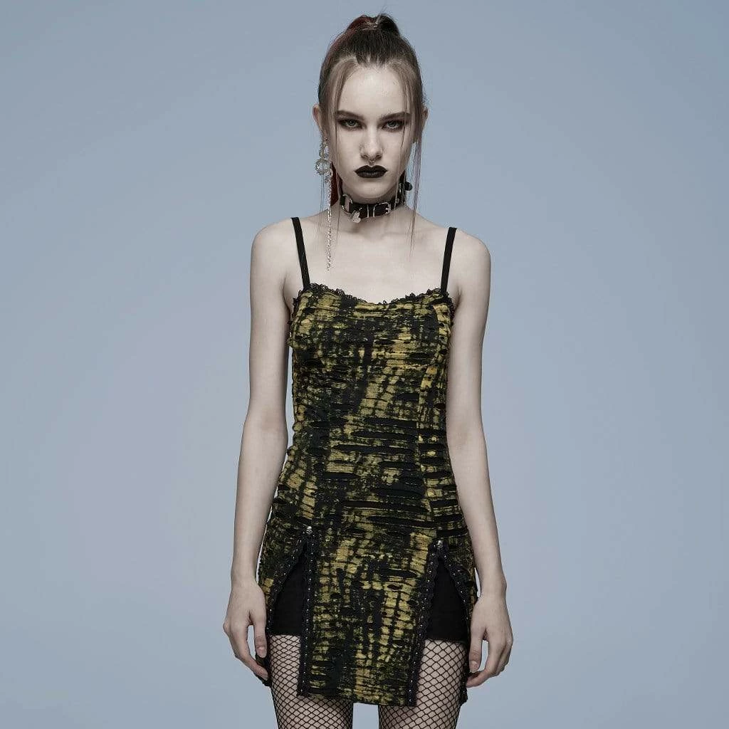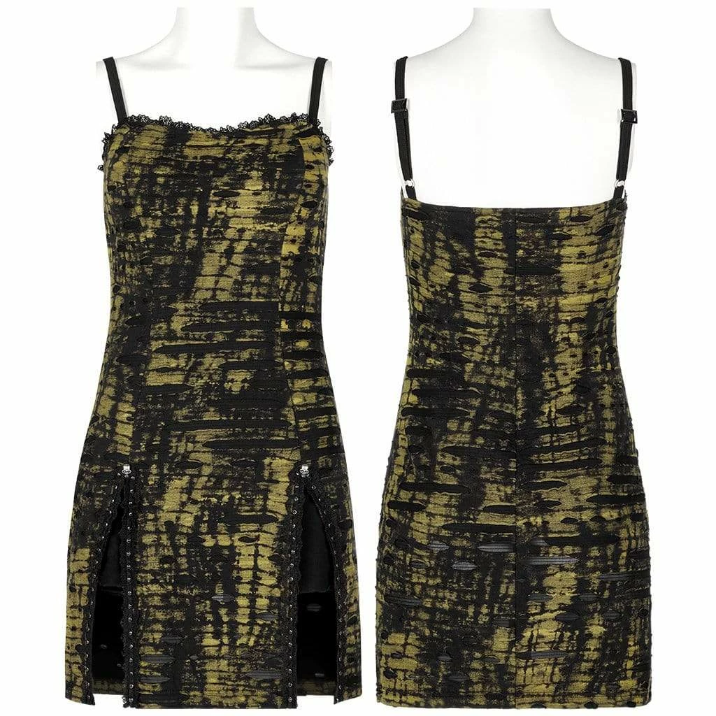 Black and yellow,, layered, tunic-style ripped dress with spaghetti straps and metal skull accents.