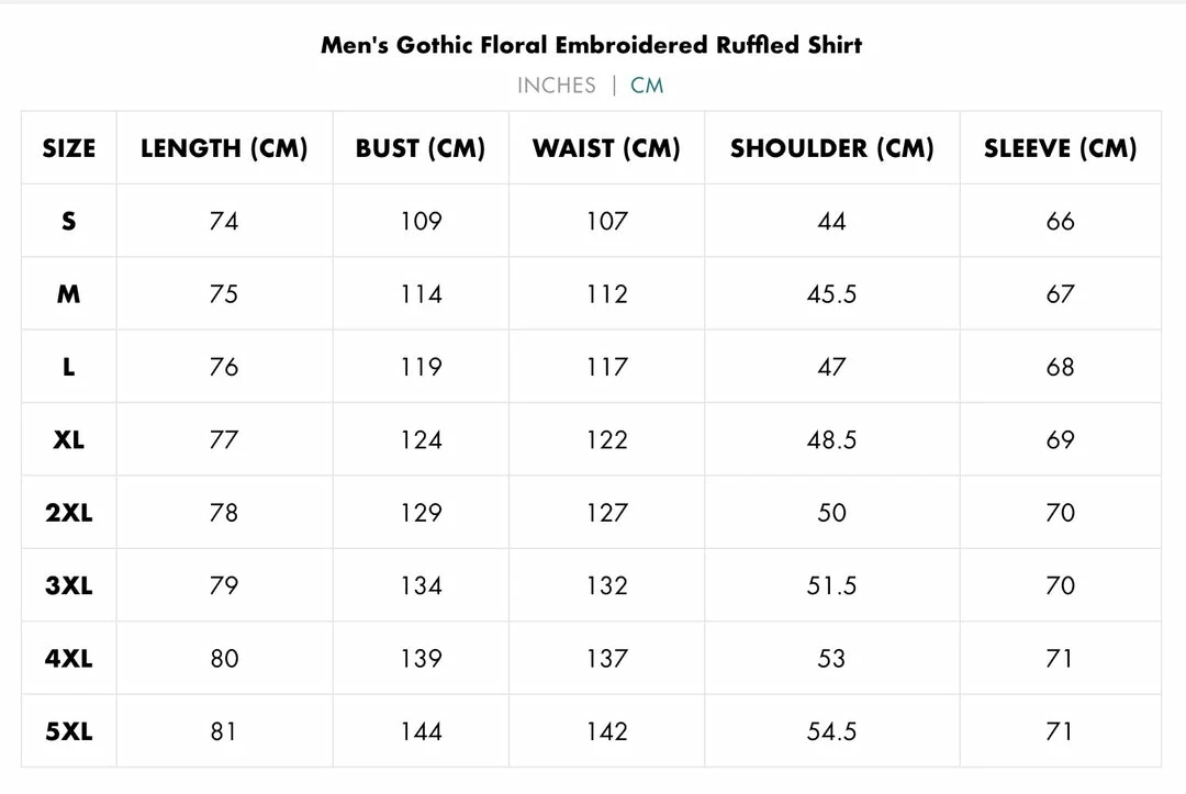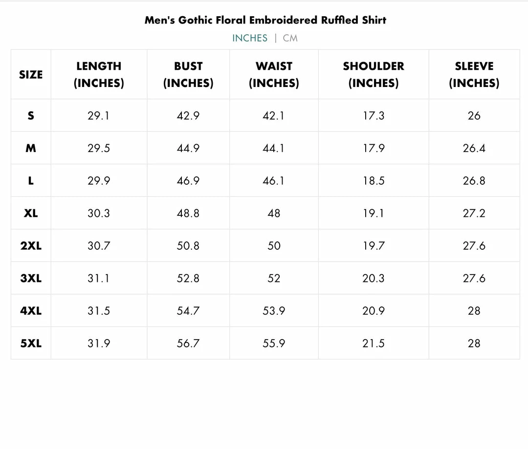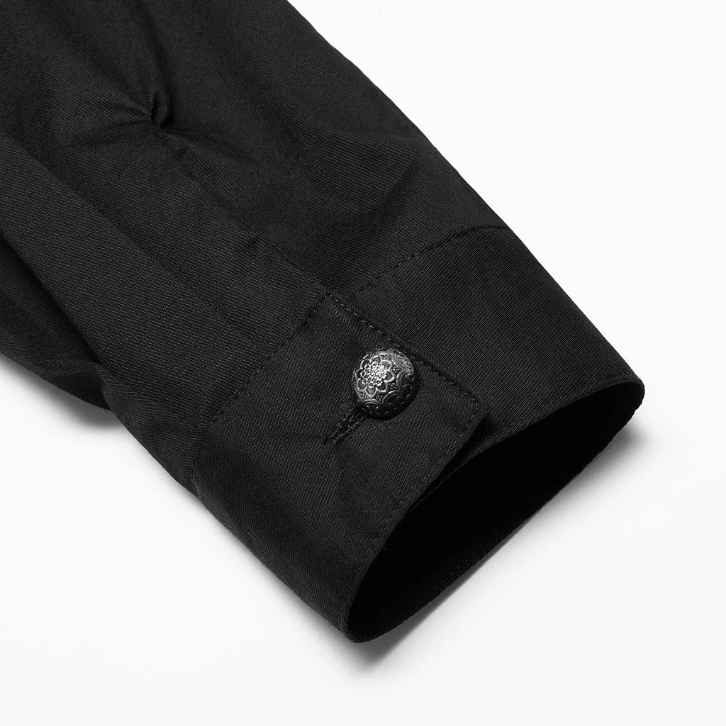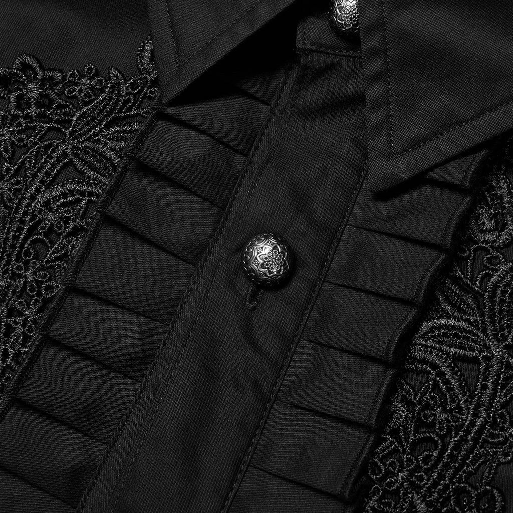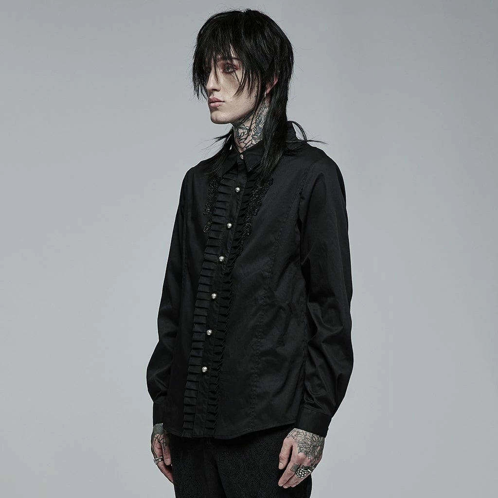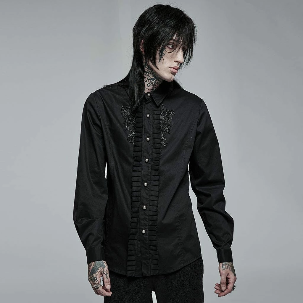 Black, long sleeve button-up shirt with ruffles and embroidered floral accects down the front.