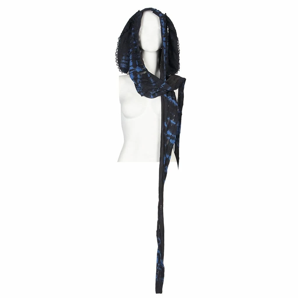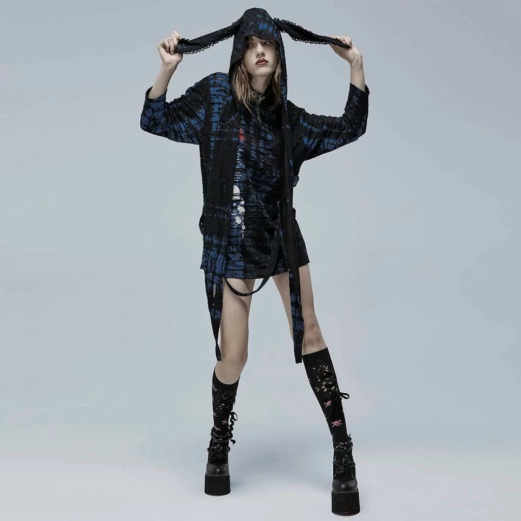 Black and blue, layered ripped shirt with detachable hood, screen-printed skull, and detachable strap.