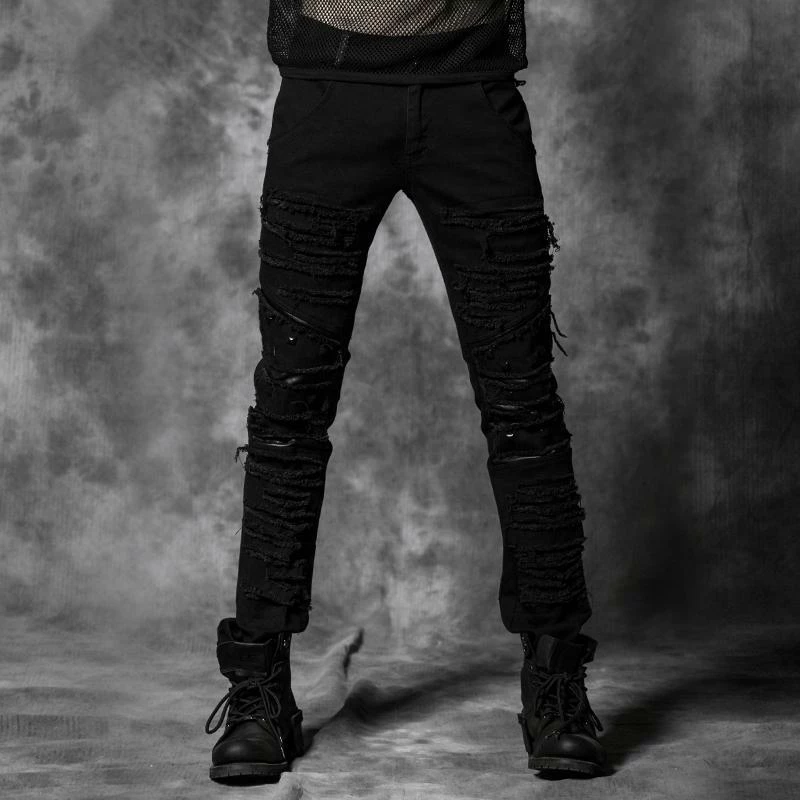 Fitted, black denim jeans with slashed legs and black pyramid studded denim patches on the knees. Jeans sit at the waist.