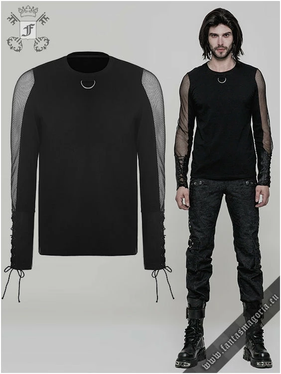 Gothic Industrial style longsleeve tight-fit top with hood, made of stretchy comfortable cotton, stretchy mesh-net and decorated with vegan leather. Synthetic leather laced details on the writs imitate long wristbands. Large D-ring on the collar. Transparent mesh details on the outer side of the sleeves, down the shoulder.