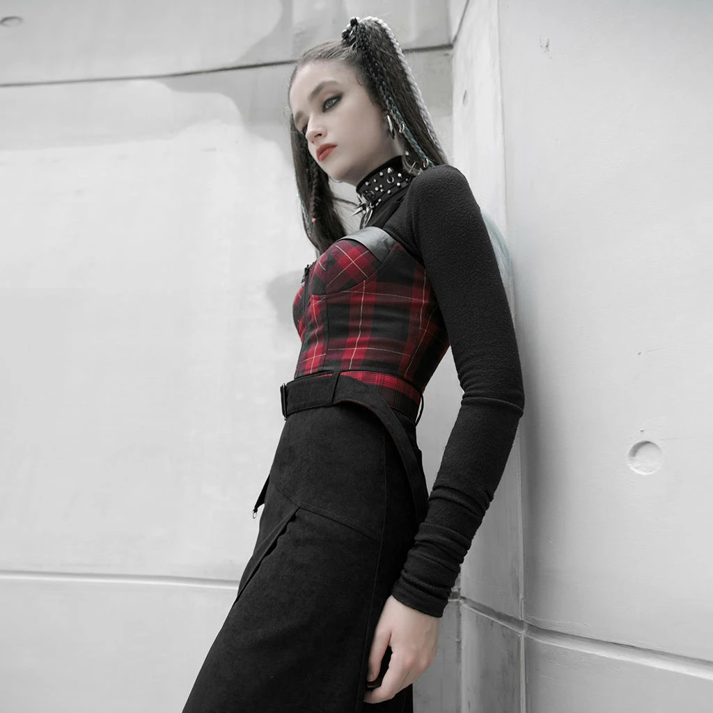 Feel like a punk goddess in the Plaid Panic Top. This cropped top is made out of black and red tartan polyester fabric and features two black PU panels on the cups as well as adjustable elastic crossed shoulder straps. Fully underwired for support, its shirring panel on the back adds some extra comfort. Fasten with its front black metallic zipper.