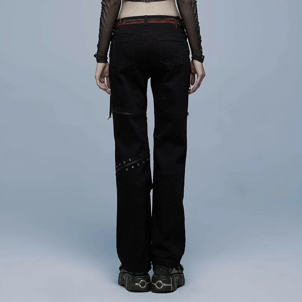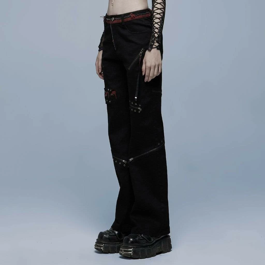 Slim fit, black flared pants with grommets, working zipper accents, and a skull button.