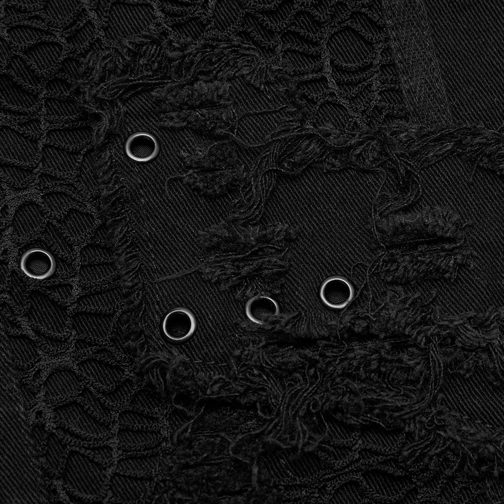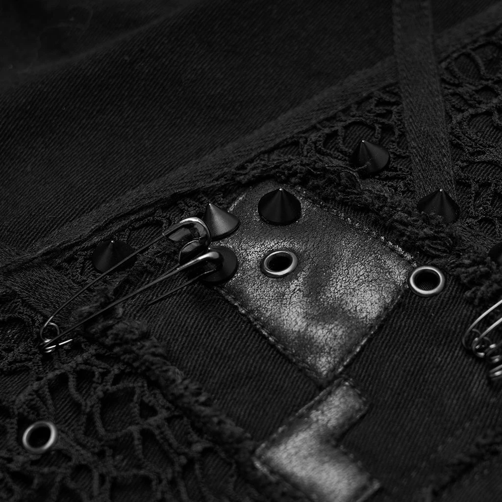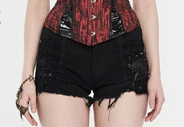 The Bad Seed shorts are made out of thick black denim and feature frayed hems for a grunge look. Heavily detailed, those black shorts feature rips on the two back and two front functional pockets, as well as fishnet appliques. Black PU patches and black metallic hardware complete the look. Fasten with the front zip fly.