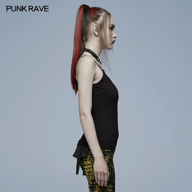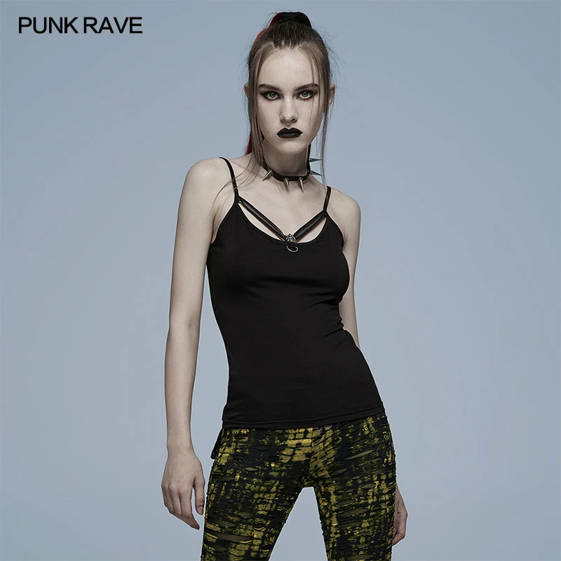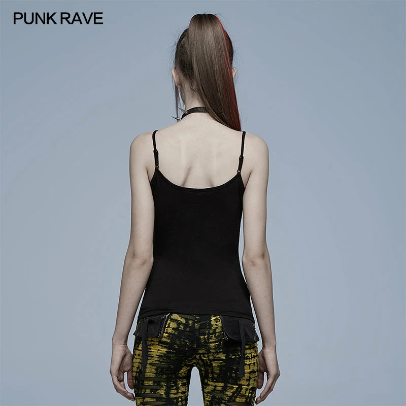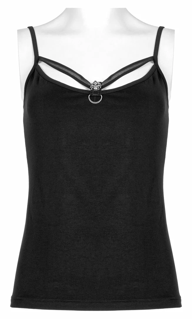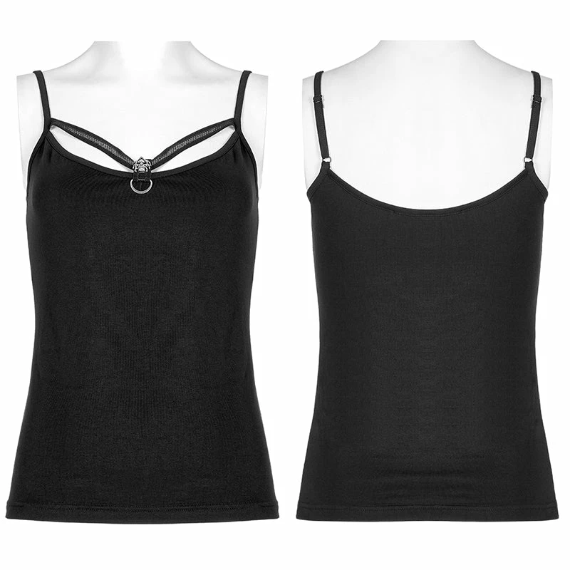 Black camisole tank top from Punk Rave. Soft elastic knitted fabric featuring a skull accent on the front, and adjustable shoulder straps.