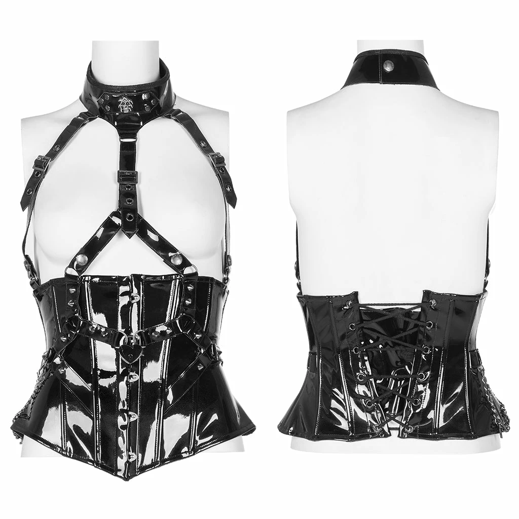 Gothic patent leather corset by Punk Rave. Features skull, chain, rivet, heart lock, and buckle accents, adjustable lacing up the back and removable straps. The whole chest loop can be detached and used as an independent waist cincher.