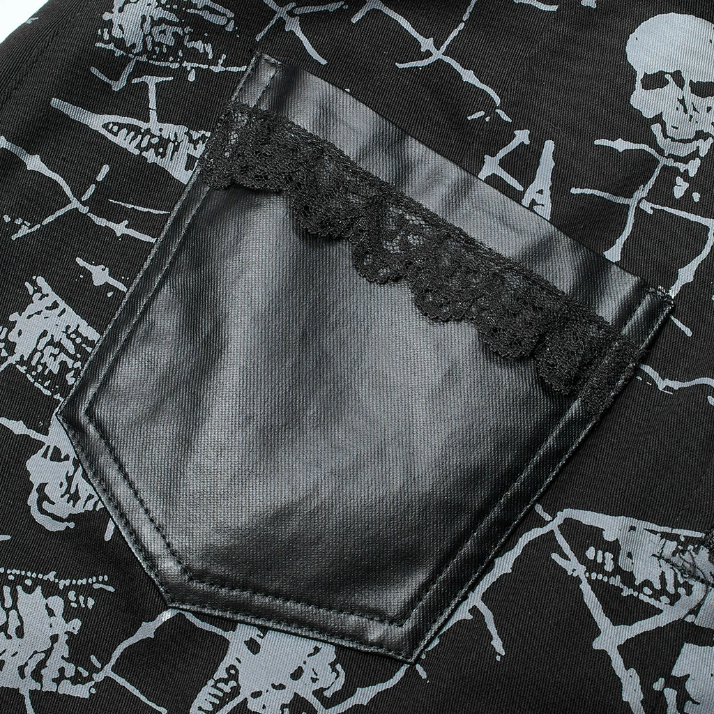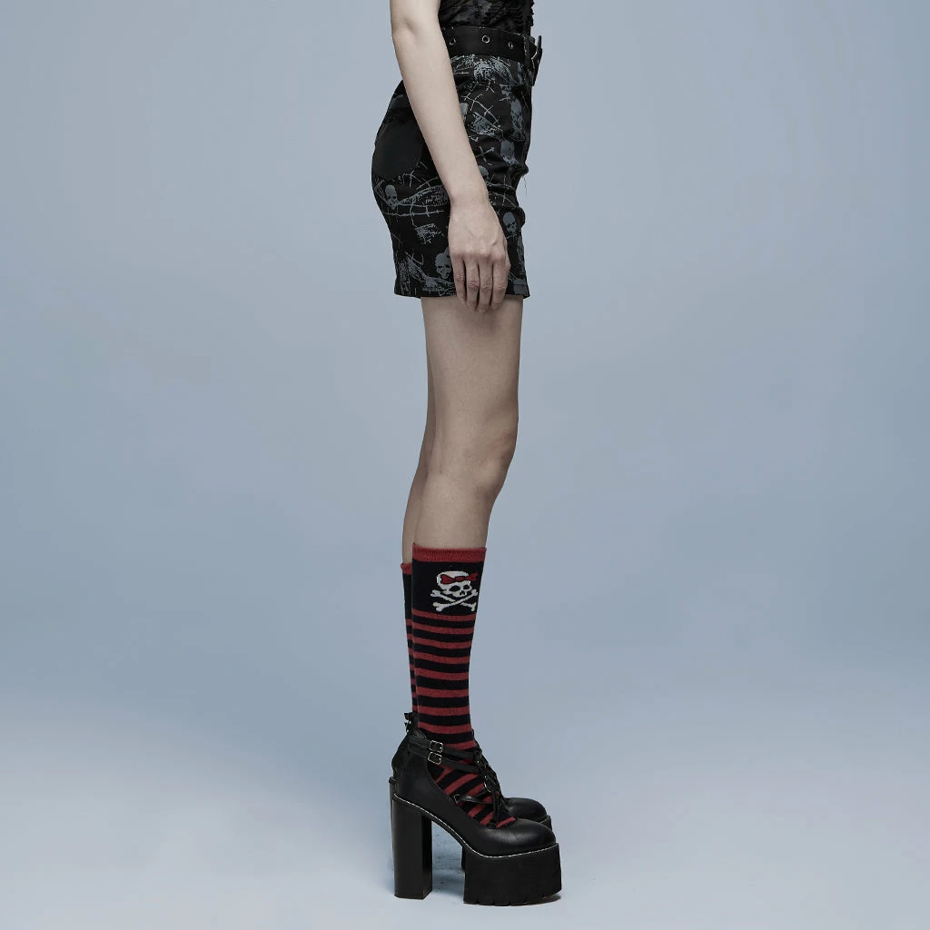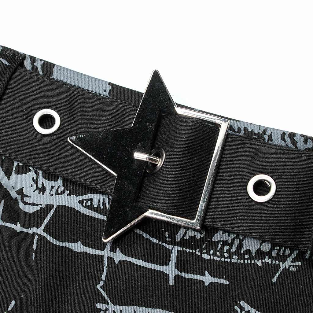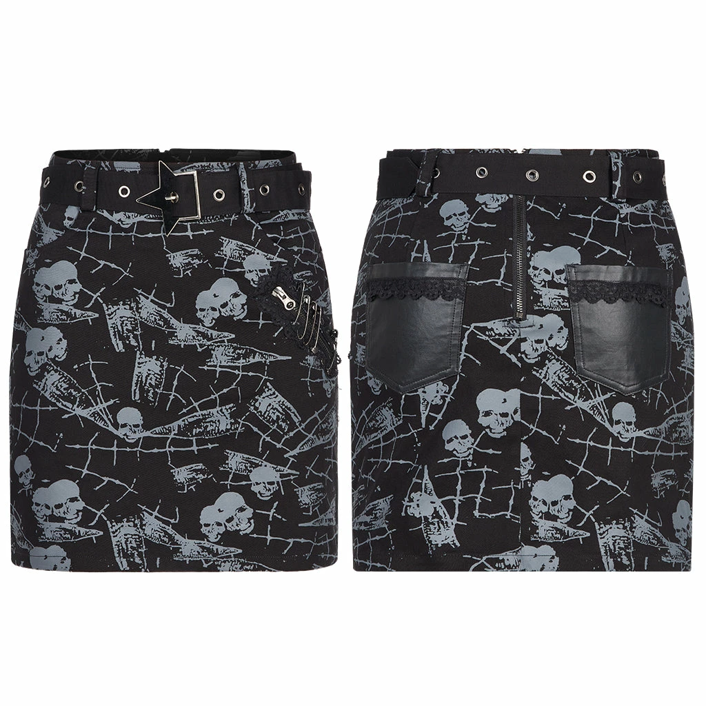 Black mini skirt from Punk Rave with skull and spiderweb print. Fitted, stretch fabric featuring a removable belt, a distinctive and pocket hardware accents.
