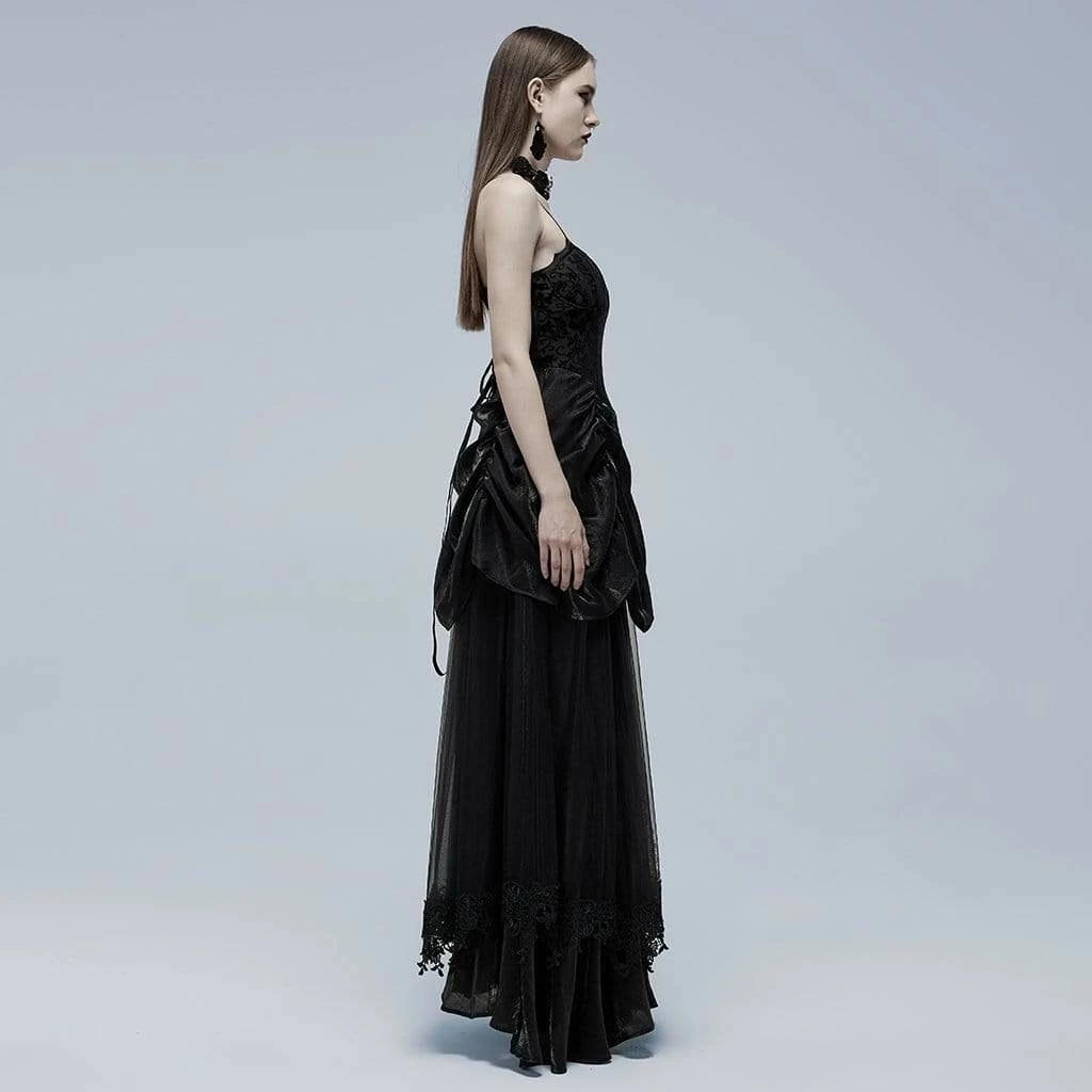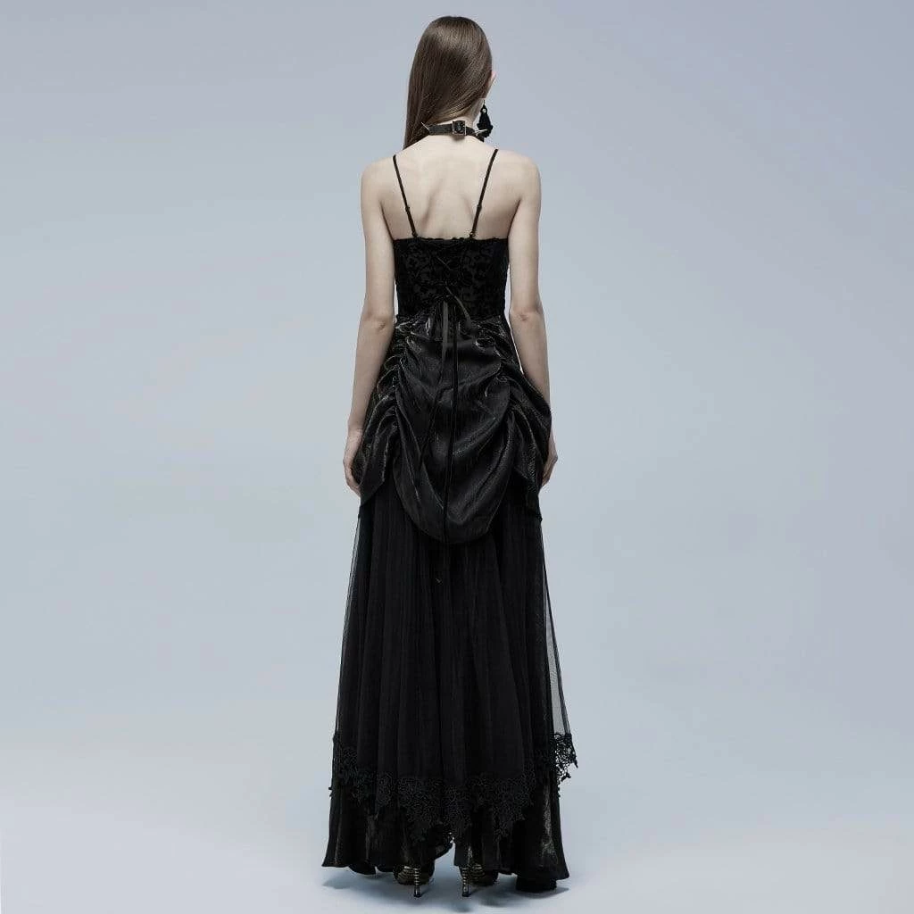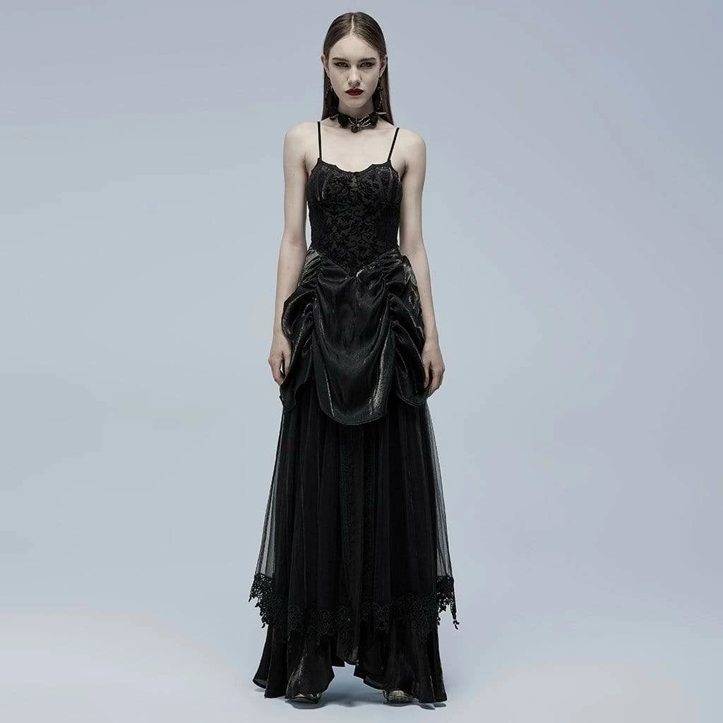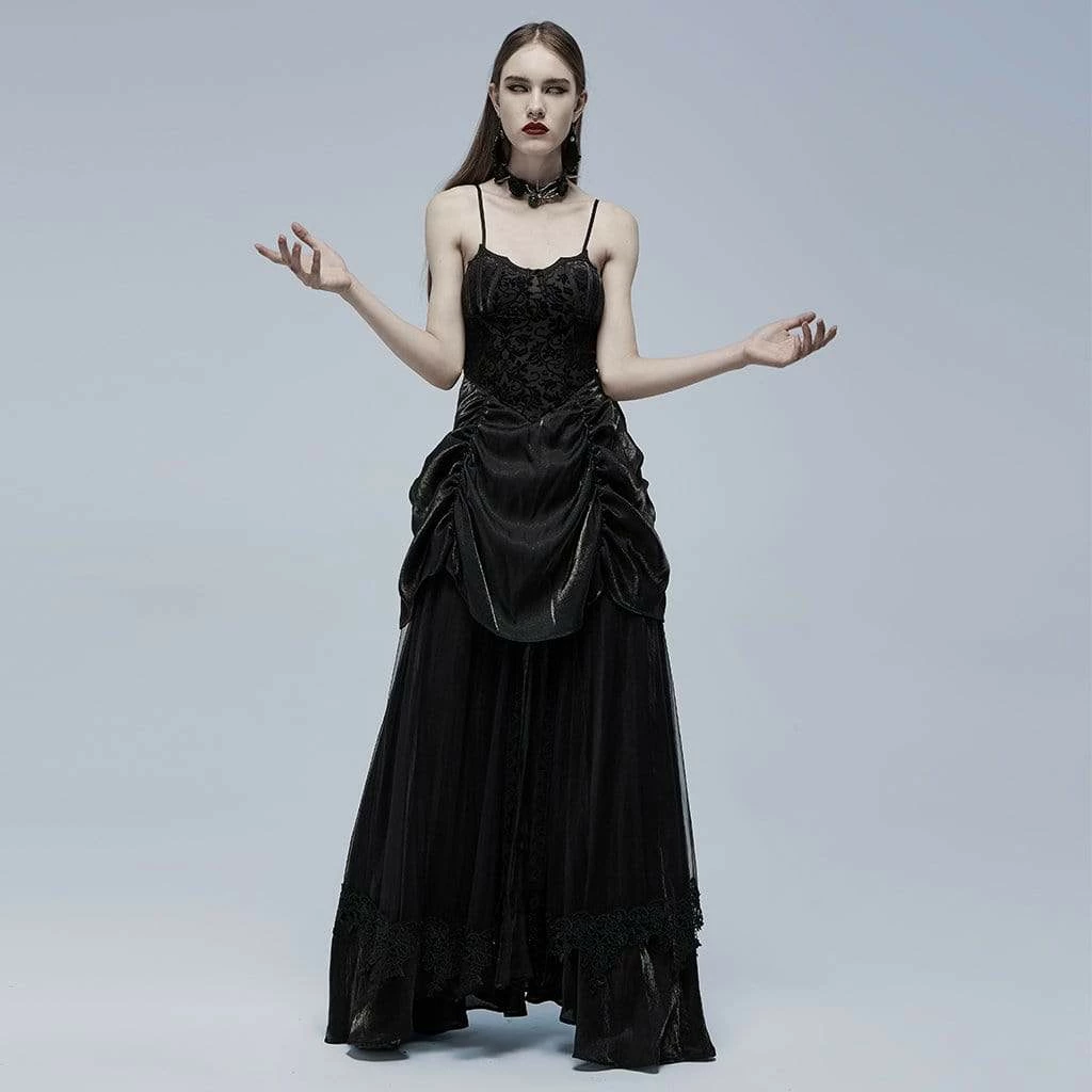Beautiful, long black dress with flocked damask pattern, layered and draped skirt covered in a black mesh with lace trim. Can be worn with or without the straps.