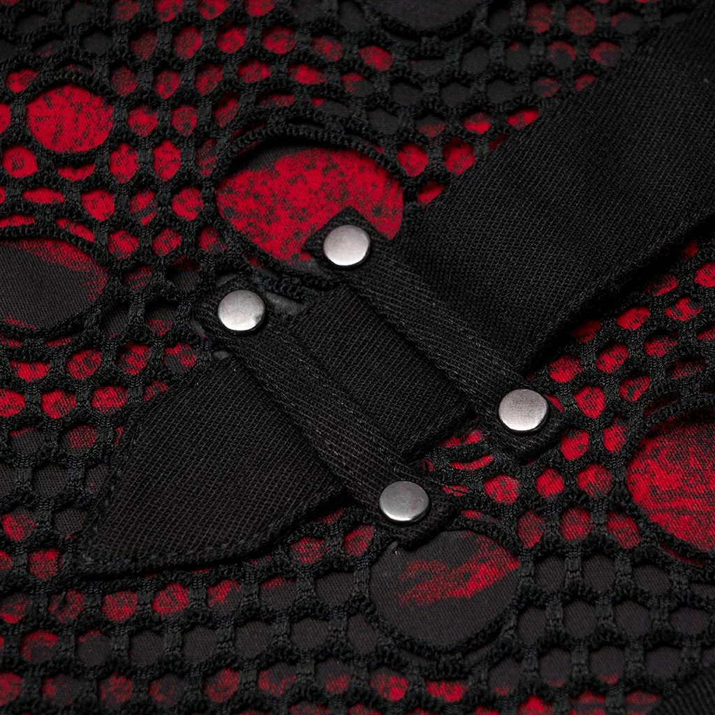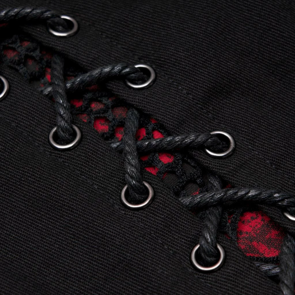 These slim-fit black pants are made of elastic woven fabrics with side stitching, black and red printed fabric with black mesh, rope and zipper accents.