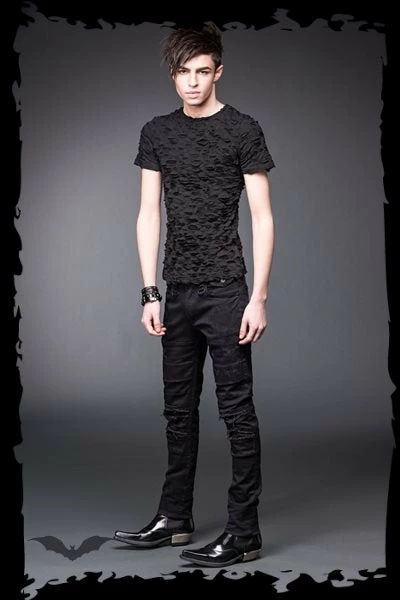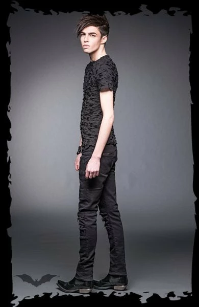 Black Pants with Slits by Queen of Darkness. Slightly stretchy material with 5 pockets, 2 d-rings on the front, 1 d-ring on the back, and shredded throughout and the Queen of Darkness bat on the buttons.